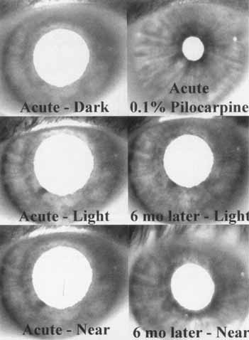 Any eye with a severe visual deficit due to retinal or optic nerve disease, with significant field loss, has a diminished ipsilateral pupillary response to light (RAPD) but an intact near reflex. For example, an eye blind from glaucoma demonstrates a light-near dissociation. Patients with profound bilateral visual loss caused by anterior visual pathway disease have bilaterally poor pupillary light responses but intact accommodative responses. Therefore, patients with bilateral end-stage glaucoma, total retinal detachments, or blindness resulting from optic nerve/chiasmal injuries should not be misconstrued as having dorsal midbrain disease on the basis of mid-dilated pupils and light-near dissociation alone because these findings may result solely from bilateral blindness. On occasion, patients with long-standing type I diabetes demonstrate moderate symmetric mydriasis with light-near dissociation that is clearly disproportionate to any concurrent retinopathy. Indeed some type I and type II diabetics may exhibit findings consistent with tonic pupils resulting from widespread autonomic dysfunction70 or local nerve damage from diode laser photocoagulation.71 Diabetic patients may also have typical A-R pupils, including miosis.72,73 When aberrant regeneration follows oculomotor nerve palsies, fibers originally associated especially with the medial rectus (although other oculomotor fibers are occasionally responsible) may anomalously innervate the pupillary sphincter as well. Frequently, aberrant regeneration results from chronic oculomotor nerve compression, typically from meningiomas and aneurysms,74 as opposed to acute ischemic insults. In such cases, the light-paretic pupil can constrict when the medial rectus muscle acts, either in convergence or with conjugate lateral gaze. Therefore, a light-near dissociation (actually, a gaze-evoked) pupillary dissociation is observed. Unlike the A-R pupil, the aberrant-regeneration pupil is large rather than miotic and is accompanied by other signs of third-nerve palsy, some paretic and some with “misdirection” features.75 Infrared videographic transillumination readily demonstrates denervated and aberrantly reinnervated sphincter segments.76 Pupillary changes seen on a slit lamp examination may provide the early evidence of aberrant oculomotor regeneration; segmental pupillary sphincter contractions may be seen with attempted eye movements in the field of action of oculomotor innervated muscles.77 In more obvious cases, the pupillary constriction may be grossly visualized with attempted efforts by any of the muscles normally innervated by the oculomotor nerve.75 Ohno and Mukuno78 report anomalous pupillary innervation by the oculomotor nerve in 6 of 10 patients with aberrant oculomotor regeneration; pupillary constriction was seen most commonly with downgaze or adduction and less frequently with upgaze. In two patients, pupillary dilation was noted on abduction. Spiegel and Kardon79 evaluated 24 patients with aberrant oculomotor regeneration. Clinically, involvement of the eyelid and pupil was evident more commonly than that of ocular motility. Pupil signs of aberrant behavior, such as gaze-evoked anisocoria, were most noticeable in dim illumination. TONIC PUPIL (HOLMES-ADIE) SYNDROMEOne of the commonest causes of isolated internal ophthalmoplegia is the tonic pupil. First described in 1931, in two separate reports, it was recognized to occur with other neurologic anomalies and subsequently named Holmes-Adie syndrome (after GM Holmes and WJ Adie). Holmes-Adie syndrome has an annual incidence of 4.7 per 100,000.80 Pupillotonia is usually unilateral, but bilateral cases do occur in which the eyes are involved either simultaneously or sequentially (Fig. 10). Unilateral cases become bilateral at a rate of 4% per year.81 Although all ages and both sexes are affected, there is an unexplained predilection for women in the third to fifth decades. Typically, the involved pupil is larger than its fellow. Because both constriction and dilation are defective, however, the tonic pupil may appear smaller in dim illumination because the normal pupil is free to dilate widely. Thus the diameter of the normal pupil may be smaller (in bright illumination) or larger (in dim illumination) than the tonic pupil. With the passage of time, the anisocoria becomes less marked as the initially larger tonic pupil gradually becomes less dilated and eventually even miotic over the years76,82 (Fig. 10). As a rule, the tonic pupil is grossly defective in its reaction to light stimulus but may show some minimal degree of contraction. On slit-lamp examination, however, irregular spontaneous low-amplitude movements may be observed. Segmental sector contractions may be seen in the portions of the sphincter that are still either not denervated or reinnervated. Also, areas of sector palsy of the iris sphincter are seen. The combination of segmental contractions and areas of sphincter palsy exhibit the characteristic worm-like vermiform movements. With prolonged accommodative effort, the pupil slowly constricts, usually not extensively. When near effort is relaxed, the dilation movement is also gradual, requiring minutes or hours for redilation. Therefore, with accommodative effort and before redilations are complete, the tonic pupil can be relatively miotic with respect to its normal opposite. These pupillary kinetics constitute the “tonic pupil,”and pharmacologic testing (Fig. 10) is additive rather than diagnostic. Disruption of the final postganglionic nerve supply to the iris sphincter accounts for denervation supersensitivity, with pupillary constriction produced by dilute parasympathomimetic agents and is the basis for pharmacologic testing for the tonic pupil. Supersensitivity to the parasympathomimetic drug methacholine 2.5%, with pupillary constriction, is a good but not foolproof test. Thompson83 suggests the use of 0.125% pilocarpine as a substitute for methacholine. 