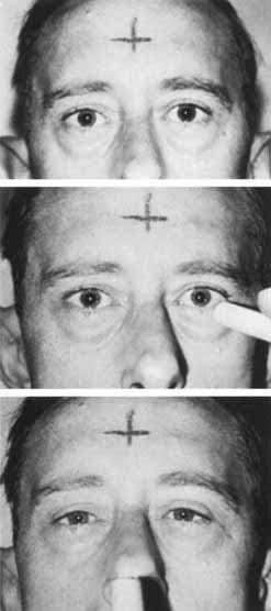 *Tonic pupil may appear smaller after prolonged near-effort or in dim illumination; affected pupil is initially large but with passing time gradually becomes smaller. †Atropinized pupils have diameters of 8–9 mm. No tonic, midbrain, or oculomotor palsy pupil ever is this large. ‡Pupils may be weakly reactive, depending on interim after instillation. RELATIVE AFFERENT PUPILLARY DEFECT When there is a significant unilateral or asymmetric visual deficit caused by optic nerve or widespread retinal disease, the pupils show a subnormal response to light stimulation of the eye with the greater field or (generally) acuity loss. The pupils have a more extensive constriction response with light stimulation of the normal or less involved eye. It is this combination of subnormal direct pupillary light response and a normal indirect (consensual) response when the opposite eye is illuminated that constitutes the relative afferent pupillary defect (RAPD). The RAPD can be demonstrated clinically by the alternate cover test, also known as the Marcus Gunn pupillary test, as described by Kestenbaum33 or by the swinging flashlight test of Levatin34 (Fig. 6). The swinging flashlight test compares pupillary responses to brief bursts of light stimulation and is more sensitive than the Marcus Gunn test, which detects pupillary dilatation after prolonged light exposure.35,36 The swinging flashlight test is best performed in a dimly lit room, using a bright light, such as a muscle light or penlight. During the test, the patient must look at a distant fixation target to avoid accommodative miosis. The test light is shone directly into the visual axis to first illuminate one pupil and then the other. The alternating or swinging light should pause 3 to 5 seconds in each eye, and this maneuver should be repeated several times. As a rule, the pupils are round and practically equal in diameter (see section on Essential Anisocoria) and briskly and symmetrically reactive to light stimuli. After an initial, prompt pupil constriction, a slight “release” dilation generally occurs. For example, in the presence of a right afferent defect (see Fig. 6), the following is observed with the swinging flashlight test: the pupillary diameters are equal and slightly larger bilaterally when the right eye is stimulated and bilaterally smaller when the normal left eye is illuminated. If only the illuminated pupil is observed—the other pupil being hidden in darkness—the following is seen: the normal left pupil constricts promptly on illumination; as the light is moved rapidly to the right, the right pupil is seen to dilate or “escape.” As the light moves again to the left, the left pupil again constricts briskly. Afferent pupillary defects may be quantified conveniently by the use of neutral-density filters placed before the normal eye. While performing the swinging light test, the neutral density filter is increased until the pupil responses are “balanced.” The neutral density value at which a positive (asymmetric) swinging light test is neutralized is read in log units.37 Previously used to assess the depth of amblyopia, the Sbisa bar (Bagolini filter bar) has also been found to be of comparable use in quantifying RAPD.38 Whether a dim, bright, or brilliant light is best suited for pupil light-reaction testing is somewhat controversial,39 but an indirect ophthalmoscope light set at 6 volts may be used as a handy “standardized” light source. Thompson and Jiang40 stress the importance of avoiding asymmetric retinal bleach, by maintaining a rhythmic “equal time” alternation of the light from one eye to the other and by not swinging the light too many times between the eyes. Thompson et al.37,41 provide detailed guidelines for proper performance of the pupillary examination and assessment of the RAPD. Computerized infrared pupillography may allow the most reliable standardization of the swinging flashlight test.35 Personal computer based infrared video pupillography has been developed for clinical use when detection and specific quantification is required. Proposed advantages to the swinging light test include the capacity to perform binocular tests, compensating for natural differences in midbrain decussation of the interneurons, asymmetric supranuclear influences on the Edinger-Westphal nucleus, and differences in efferent innervation of the pupils. Furthermore, the RAPD may be recorded at different light intensities independent of motion, pattern and color, and free of observer bias.42 Pupillography also measures response latency and cycling time, which can be delayed in diseases of the afferent and efferent visual pathway and amblyopia.43 Quantification of RAPD may be used to gauge the degree to which the anterior visual pathway disruption has occurred or as a prognostic indicator for final visual recovery. In a small series, Alford et al.44 found that patients with traumatic optic neuropathy and an initial RAPD of log 2.1 or greater showed minimal visual recovery even after megadose intravenous steroid therapy. Those with RAPD measurements less then log 2.1 recovered to visions of 20/30 or better. An afferent pupillary defect may be assessed even if one of the pupils is unreactive because of mydriatics, miotics, oculomotor palsy, trauma (Fig. 7), or synechia formation. In such cases, when performing the swinging flashlight test, the direct and consensual responses of the single reactive pupil must be compared. The reactive pupil's direct light response reflects the afferent function of the ipsilateral eye; its consensual response reflects the afferent function of the contralateral eye. Even severe unilateral visual loss due to retinal or optic nerve diseases associated with an afferent pupillary defect is not of itself a cause of anisocoria, despite past statements to the contrary (see later text: Behr's sign). If a patient with an RAPD also shows anisocoria, the pupillary inequality must be treated as a s