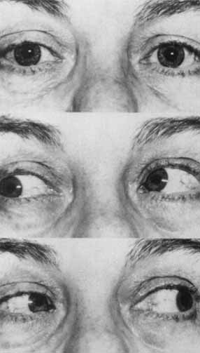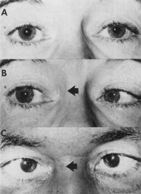As discussed previously, the neural pathways controlling the near reflex and accommodation are not defined precisely. As a rule, in those disorders that interrupt the parasympathetic supply to the pupil sphincter, accommodation is also defective because of denervation of the ciliary musculature. In certain situations, however, where the convergence–accommodation mechanism is faulty, pupillary reflexes are spared or minimally involved. The accommodative power of the eye is difficult to assess because of the subjective nature of the end point and the great dependency on cooperation of the patient. A unilateral accommodative deficiency is easier to define because the uninvolved eye serves as a normal “control.” Accommodation is usually measured in terms of near point: the shortest distance from the naked eye at which an accommodative target can no longer be focused and appears blurred. Alternatively, the maximum power of minus lenses that the eye can overcome to see clearly with best-corrected distance acuity may be used. The most common defect of accommodation is presbyopia and is related to aging. Currently, it is thought to result from progressive thickening and stiffness of the lens, which changes its refractive power with age. However, the degree to which the aging lens and other factors, such as changes in the ciliary muscle and declining accommodative convergence, contribute to presbyopia has yet to be determined. In the presbyopic eye, accommodation is difficult to assess and unilateral defects are rare. Unilateral or asymmetric lens opacities or brunescence, however, may present with “accommodative” symptoms, but slit-lamp examination quickly resolves this diagnostic dilemma. Occasionally, rapid changes in the refractive power of the eyes take place during poorly controlled diabetes mellitus, with resulting increase in the refractive index of the lenses. In this case, the patient becomes more myopic and reports blurring of distant vision; however, presbyopic patients may suddenly be able to read without the aid of bifocals. This situation should immediately suggest a state of hyperglycemia. Defective accommodation almost always accompanies pupillotonic syndromes and also peripheral oculomotor nerve palsies, in which instance blurred vision is the least dramatic aspect and may go unnoticed by both the patient and the physician. Local ocular disease, traumatic, inflammatory, or otherwise, need not be discussed. Many individuals complain of rather vague problems of “focusing” the eyes, and, as a rule, nothing is found. Fortunately, these patients are usually well equipped with other aches, pains, and ill-defined asthenopic symptoms. In some instances, however, symptoms of accommodative and convergence insufficiency appear to be valid residue of cerebral concussion or cervicocranial hyperextension injury (“whiplash”). These symptoms may extend from weeks to years in duration and are, at times, miraculously relieved by litigation settlements. Here the physician is at the mercy of variations in patient cooperation and strictly subjective end points. It may be impossible to separate the patient with true posttraumatic accommodative–convergence insufficiency from the dissembler, unless objective signs are present or a positive response to therapy excludes the latter possibility. Paralysis of accommodation classically occurs in children with diphtheria, a disorder encountered rarely in the United States. Postdiphtheritic paralysis is attributed to a demyelinating toxin with a special predilection for cranial nerves. Contamination of food with Clostridium botulinum is responsible for a serious form of food poisoning (i.e., botulism). Typically, botulism is caused by ingestion of toxin that has been produced in contaminated foods. In infants and rarely in adults, botulism can also be caused by in vivo toxin production after colonization of the gastrointestinal tract by C. botulinum organisms.217 The elaborated exotoxin interferes with cholinergic transmission, resulting in the clinical picture, similar to insecticide poisoning, of an alert patient with dilated nonreactive pupils, accommodative paralysis, dry mouth, and respiratory distress. Tyler218 has pointed out that only one-third of patients experience an acute gastrointestinal episode (nausea, vomiting, and diarrhea). Dizziness, headache, blurred vision, diplopia, and swallowing difficulties should alert the physician to the possibility of botulism.219 The pupillary and ciliary musculature may be paretic in the ophthalmoplegic form of acute idiopathic polyneuritis. Clinical involvement of the internal ocular muscles in myasthenia probably does not occur, although this is a controversial subject. The presence of internal ophthalmoplegia, as a rule, makes a diagnosis of ocular myasthenia untenable (unless the patient has another cause of the internal ophthalmoplegia). Rostral–dorsal midbrain lesions may result in a state of spastic–paretic accommodation, usually accompanied by moderately dilated, light-near dissociated pupils, upgaze palsy, and retraction nystagmus (the periaqueductal syndrome). When shifting gaze from distance to near, accommodation is paretic; on attempted upward gaze, accommodative spasms occur such that distant vision is blurred because of momentary myopia (see previous discussion of periaqueductal syndrome). Spasm of the near reflex may be associated with organic disease.220,221,222 However, even then there may be an element of functional disturbance superimposed on the organic process. In most instances, spasms of accommodation are of functional origin. Some degree of convergence excess is common, such that an esotropic deviation may mimic a unilateral or bilateral abduction deficiency (Fig. 20). Pupils that become constricted on lateral gaze attempts should be the clue to such hysterical “spasm of the near reflex.” Atropinization, nonspecific “eye exercises,” time, and litigation set