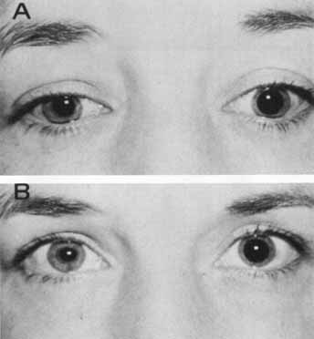 Horner's syndrome consists of mild to moderate ptosis of the upper lid due to paresis of Muller's muscle, pupillary miosis, apparent enophthalmos, and ipsilateral anhydrosis. The lid fold is lost (Fig. 15) and is a subtle confirmatory sign. The lower lid may be somewhat elevated because of paresis of smooth muscle attached to the inferior tarsal plate. This can be evaluated by noting the relationship of the lower lid margin to the corneoscleral junction (inferior limbus). Ptosis of the upper lid and elevation of the lower lid narrow the interpalpebral fissure. Thus, the eye may be described as looking “smaller” or seeming to be enophthalmic. This enophthalmos is more apparent than real.124,125 The pupil is variably miotic, depending on the location, completeness, and chronicity of the defect. The pupillary diameter is usually reduced by 0.5 to 1 mm. Although it reacts normally to light and near stimulation, the Horner's pupil demonstrates delayed redilatation in the pupillary light reflex.126 Anisocoria due to Horner's syndrome is more marked in dim illumination (evoking dilation) than in bright light. Furthermore, other stimuli that usually increase sympathetic tone, such as pain and sudden loud noises also increase the anisocoria. Heterochromia with Horner's syndrome (the lighter iris in the same eye) is usually considered a sign that the sympathoparesis is congenital or acquired in infancy. However, progressive heterochromia has been reported following acquired Horner's syndrome in adults.127,128 It must be stressed that heterochromia occurs in a multitude of ophthalmic conditions, some of which are outlined in Table 7.
