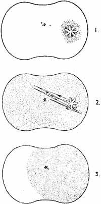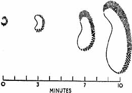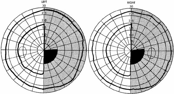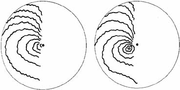 One important aspect of the visual disturbance just described, is that it expands slowly, over a period of 10 to 20 minutes. The initial region of visual abnormality is most often near fixation and then, as described by Lashley,49 with increase in size the disturbed area moves or “drifts” across the visual field so that its central margin withdraws from the macular region as its peripheral margin invades the temporal; the area may be totally blind (negative scotoma), amblyopic or outlined by scintillations. The scintillations surrounding the negative scotoma make “fortification” figures or spectrums, so called by the appearance of a “map of the bastions of a fortified town.”49 The scintillations are brilliant, with the intensity of a bright fluorescent bulb flickering at a rate of 5 to 10 cycles per second (Figs. 4 and 5). Gowers,68 commenting on the descriptions by the British astronomer, Sir George Airy, and his physician son, Dr. Hubert Airy (both migraineurs), was particularly impressed with the intensity of the visual sensation. Many migraine sufferers can precisely recall their own vivid visual experiences well enough to describe them precisely or even on occasion to paint them (Fig. 6 and 7). Not all migraine visual disturbances begin near the fixation point; some patients consistently experience scotomas starting eccentrically in the visual field, and these sensations can appear alternately or simultaneously in both hemifields (Fig. 8). Other less dramatic visual auras also occur: just the sensation of peripheral brightness or awareness of a rhythmicity or pulsating character in the intensity of the ambient light. The duration of these visual symptoms is measured in minutes rather than the brief few seconds of flashing, bright moving spots, or transient flickering phenomena characteristic of occipital epileptic discharges.7,68 Additional visual disturbances are categorized by Klee and Willanger,66 consisting of metamorphopsia, diplopia, polyopia, and apparent movement of stationary objects. Variations in the scotomas of migraine, including their occurrence in patients with acquired blindness, are well described.65,69 The auras of migraine, although most commonly only visual, have many other associated manifestations, such as hemihypesthesias, perioral anesthesia, vertigo, and transient aphasia. The aura or prodromes of classic migraine may be precipitated by intense stimuli: bright lights, loud noises, head trauma, or the intake of certain foods in susceptible individuals. In the usual sequence of migraine with aura the sensory prodrome precedes the onset of the headache (in accord with the traditional concept of vasoconstriction followed by vasodilatation). The visual disturbance rarely may have a simultaneous onset with headache or, once having disappeared, may recur following the onset of headache. Such unusual patterns, or strict unilaterality for all attacks, should increase suspicion of a mass lesion or vascular malformation. As opposed to definite periodicity with symptom-free intervals and predictable circumstances, as in migraine without aura, migraine with aura may occur “out of the blue” and in multiple attacks over a few days. Migraine-with-aura attacks tend to diminish in the third and fourth decades. While most migraine patients experience a stereotyped clinical pattern, there is a well-recognized group in which both classic and common migraine attacks are admixed.70 Some patients with classic migraine may lose the headache component eventually and suffer only isolated auras thereafter. This monosymptomatic pattern stresses the importance of accurate history-taking when confronted by a patient with isolated visual phenomena (migraine dissociée). Haas71 emphasized the occurrence of “migraine aura status”. The differential diagnosis should include consideration of vertebro-basilar transient ischemic attacks. Symptomatology that favors migraine has been reviewed by Fisher,72 and includes luminous visual images, build-up of images, progression from one aura to another, and benign outcome. |