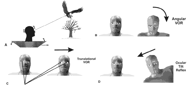 options. NORMAL FUNCTION: THE VESTIBULAR REFLEXES Vestibular reflexes are triggered by head movements. Imagine a bird watcher standing in a rocking boat traveling downstream (Fig. 1A). To identify a bird roosting on a tree, the image of the bird must be kept stable on the retina by three separate vestibular reflexes (see Fig. 1B). As the boat pitches up and down the eyes must move in the opposite direction and synchronously with the angular motion of the head to keep the eyes stable in space. This is accomplished by the angular vestibulo-ocular reflex (VOR), which is sensed by the semicircular canals in the inner ear (see Fig. 1B). As the boat moves down the river toward the bird, the eyes must move horizontally in the opposite direction synchronously with the linear motion of the boat. This is accomplished by the linear VOR, which is sensed by the otoliths in the inner ear (see Fig. 1C). Figure 1D shows the most complicated reflex as the boat tilts left and right. To keep the head and eyes level during tilt to the right, the right eye is elevated in the orbit and the left eye is depressed (skew deviation). Both eyes undergo torsion to the left within the orbit (counter-roll deviation) and the head is tilted to the left on the body (head tilt). This is accomplished by the ocular tilt reflex, which is sensed by the otoliths. Without these vestibular reflexes, visual acuity would be degraded and diplopia would occur. Table 1 lists the three vestibular reflexes, the sensory organs involved, and the motor output for each reflex.