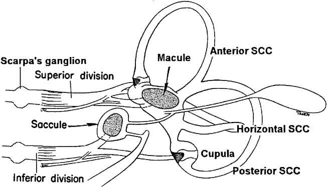 PATHOPHYSIOLOGY Peripheral Structures The vestibular sensory organs lie within the membranous labyrinth of the inner ear, protected in the petrous portion of the temporal bone. The membranous labyrinth consists of three semicircular canals (SCCs)—the anterior, posterior, and horizontal—that lie 90 degrees (orthogonal) to each other, and two otoliths, the utricle (horizontally aligned) and the saccule (vertically aligned) (Fig. 2). The labyrinth is innervated by the vestibular nerve, which is part of the VIIIth nerve. The vestibular nerve contains two fascicles, the superior and inferior divisions. The cell bodies of each axon of the VIIIth nerve lie in Scarpa's ganglion, located in the internal auditory canal. The superior division innervates the utricle and the anterior and horizontal SCCs. The inferior division innervates the saccule and posterior SCCs. Within each semicircular canal is an area of hair cells that protrude theirprocesses into a gelatinous matrix called the cupula. Angular head acceleration imposes inertial forces on the endolymph fluid within the canal, which causes relative fluid flow through the canal in the direction opposite to that of head acceleration. This flow deflects the cupula and bends the hair cells (Fig. 3). During head acceleration, these hair cells bend in proportion to head acceleration and change the neuronal firing rate in the VIIIth nerve. Because each Scarpa's ganglion is spontaneously “firing” at 100 spike/sec, head motion (acceleration or deceleration) modulates this firing rate. The firing rate is increased for ipsilateral angular head movements and decreased for contralateral angular head movements. The otoliths also contain a local region of hair cells. The hair cells protrude their processes into a gelatinous matrix called the macula, which is covered by a surface of calcium carbonate crystals, the otoconia. The otolith organs respond to linear acceleration and sustained head tilt relative to gravity. Linear acceleration (including tilt of the head) causes these crystals to move, which bends the hair cells and modulates the firing rate in the VIIIth nerve. The firing rate is increased for ipsilateral linear head movement or tilt, and is decreased for contralateral linear head movement and tilt.