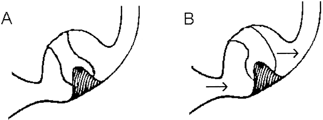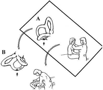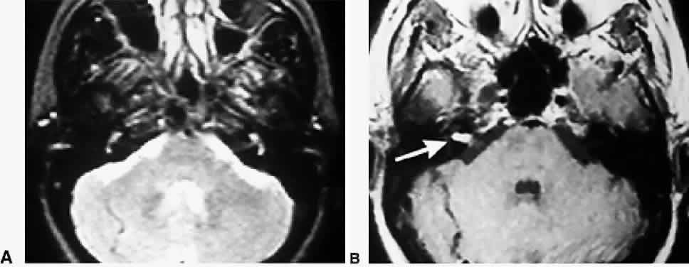 ACOUSTIC NEUROMA Acoustic neuroma is a benign tumor of the myelin sheaths of the vestibular nerve (VIII) and usually is characterized by unilateral hearing loss or tinnitus. Rarely does it cause vertigo or disequilibrium. Audiography shows features consistent with a retrocochlear process, which consists of poor speech discrimination relative to the degree of tone loss and recruitment in which increments in tone intensity cause a higher than expected increase in perceived tone loudness. The diagnostic procedure of choice for acoustic neuroma is gadolinium-enhanced MRI sections of the posterior fossa that include the VIIIth nerve and other cerebellopontine angle structures (Fig. 8). Surgery is the treatment of choice, either by middle cranial fossa approaches (for tumors confined to the internal auditory canal, with usable hearing), by suboccipital craniotomy (for large tumors or those adherent to the brainstem, with usable hearing), or by a translabyrinthine approach (for small tumors, with no usable hearing).31 With questionable or small intracanalicular tumors, especially in elderly patients or in those in poor medical condition, watchful waiting is prudent, with neuroimaging repeated at 6- to 12-month intervals. Focal radiosurgery may be ideal for recurrent tumors and for patients in poor medical condition who cannot tolerate posterior fossa surgery.31 Tumor control is achieved in 95% of patients, but approximately 25% to 30% develop 5th and 7th cranial nerve loss and hearing loss caused by involvement of the vascular supply.31,32 ACUTE VESTIBULAR NEURITIS AND LABYRINTHITIS Acute vestibular neuritis and labyrinthitis are associated with intense vertigo, nausea, and disequilibrium that persist for days. It is caused by a viral infection of the superior portion of the vestibular nerve (neuritis) or of the endolymph of the labyrinth (labyrinthitis). A viral etiology has been postulated, and recent data suggest a reactivation of dormant herpes infection in Scarpa's ganglia.33,34 Diagnosis of these entities is based primarily on clinical presentations. If associated with significant hearing loss (frequently with tinnitus), the disorder is labeled labyrinthitis; otherwise it is labeled vestibular neuritis. Viral serologic studies are superfluous and their results do not alter treatment. Differential diagnoses include infarcts of the labyrinth and a first attack of Meniere's disease. Audiography should be obtained when patients complain of hearing loss. After several days, caloric testing may document the extent of vestibular defects. In appropriate circumstances, serum fluorescent treponemal antibody absorption testing and erythrocyte sedimentation rate are used are performed to rule out otic syphilis and giant cell arteritis. Admission to a hospital may be required for extreme dehydration from vomiting or when a central disorder is suspected. During the first few days, vestibular suppressants should be used, such as intramuscular promethazine (Phenergan; 25 to 50 mg) in the office and promethazine suppositories at home. Ondansetron (Zofran) may also be appropriate for patients with severe vertigo and nausea, but currently it is approved only for chemotherapy-induced nausea.35 Keeping patients on vestibular suppressants too long is a common error because these drugs delay vestibular adaptation. Consequently, these medications should be discontinued and vestibular exercises started as soon as possible. The patient should be reassessed after a few days to make certain that symptoms are resolving. After an acute insult, the imbalance of spontaneous neural activity in the vestibular nucleus usually corrects itself within several days, possibly through commissural pathways between the vestibular nuclei. What remains is a low gain in the VOR from which patients perceive vertigo or unsteadiness during head movements. This defect can be treated with vestibular rehabilitation (see Disequilibrium). BENIGN PAROXYSMAL POSITIONAL VERTIGO Benign paroxysmal positional vertigo is characterized by vertigo that lasts less than 1 minute. It usually occurs in the morning upon arising or even when turning over in bed. Symptoms also may be caused by reclining or extending the head backward. After a severe attack, patients frequently complain of disequilibrium that lasts for several hours. BPPV usually is idiopathic but also may occur after head trauma, labyrinthitis, or ischemia in the distribution of the anterior inferior cerebellar artery. The pathophysiologic mechanism of BPPV is related to portions of otoconia from the utricle that are displaced and free floating (canalithiasis) in the posterior SCC. Occasionally it is caused by otoconia attached to the cupula of this canal (cupulolithiasis). Both these conditions cause inappropriate neural afferent discharge from the posterior SCC after the head stops moving backward. The diagnosis is secured by eliciting a torsional-upbeat nystagmus associated with vertigo during the Hallpike-Dix test when the affected ear is inferior. In this test, the patient is seated on an examination table with the head rotated 45 degrees to one side; he or she is then quickly moved backward into a lying position with the head still deviated and hanging over the side of the table (Fig. 9). BPPV also may occur from debris in the anterior or horizontal SCC, but the nystagmus induced by the Hallpike-Dix test is downbeat and horizontal, respectively. The nystagmus found in BPPV usually has a latency of 3 to 20 seconds, fatigues within 1 minute, and decreases with repeat testing. BPPV is best treated by a maneuver called the canalith repositioning maneuver,36 which moves the otoconia out of the posterior SCC and back into the utricle, where it is reabsorbed into the calcium matrix. Total remission or significant improvement from BPPV occurs in 90% of patients using theis maneuver,37 and complications are rare.38 During the canalith repositioning maneuver, the patient is seated with the head