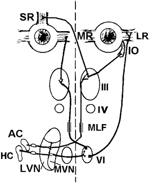 MVN, medial vesbibular nucleus; SCCs, semicircular canals; INC, interstitial nucleus of Cajal; NOT, nucleus optic tract.