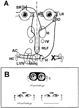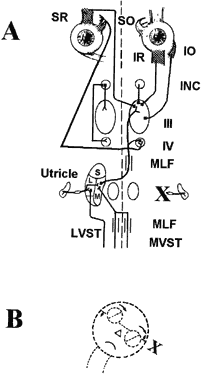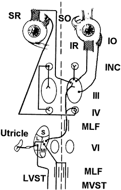 Semicircular Canals Each SCC innervates two eye muscles by means of a three-neuron arc. The central connections of the horizontal and anterior SCCs on one side are shown in Figure 4. The projections of these two SCCs are shown together because usually they are both involved in vestibular neuritis, the most common cause of severe vertigo. The pathophysiology of vestibular neuritis is diagrammed in Figure 5. This disorder disrupts the superior division of the vestibular nerve.2 Because the Scarpa's ganglion on each side normally is firing at 100 spikes/sec, any loss of activity on one side results in relative excessive excitation from the intact side. This large bias in neural activity causes nystagmus. The direction of nystagmus is determined according to the quick phase, but the vestibular deficit is actually driving the slow phase of the nystagmus. Vestibular neuritis results in a mixed horizontal and torsional nystagmus. This pattern of nystagmus is caused by the innervation pattern of the superior division of the VIIIth nerve on the intact side (recall that the superior division innervates the horizontal and anterior semicircular canals; see Fig. 2). Relative excitation of the horizontal SCC causes horizontal nystagmus with the slow phase toward the side of the lesion. Figure 5 depicts a left-sided lesion, which would cause a right-beating nystagmus. Relative excitation of the anterior SCC causes torsional nystagmus (counterclockwise nystagmus for a left-sided lesion). Because of the confusion over whether to label torsional nystagmus from the perspective of the observer or the patient, the current trend is to assess torsional nystagmus according to the direction of the quick phases toward which the superior poles of both eyes are beating. Thus, a left-sided lesion results in right beating and right torsional nystagmus (see Fig. 5B). There are two other key features of vestibular nystagmus. The intensity of nystagmus is increased when fixation is blocked (Fig. 5B depicts increased nystagmus when the subject looks through Frenzel or 20-diopter lenses), and the intensity of nystagmus also increases when the patient looks in the direction of the quick phases. Otoliths Each otolith innervates four eye muscles by means of a three-neuron arc. The central connections of the utricle on one side are shown in Figure 6.3 The projection to the vertical muscles causes vertical eye deviation and torsion during head tilt. The projections in the lateral and medial vestibulospinal tracts mediate the head tilt during the ocular tilt reflex. Acute loss of function of the utricle on one side from the VIIIth nerve section or vestibular neuritis causes a pathologic ocular tilt response because of the unopposed excitation of the intact utricle. Figure 7 depicts the results of a left-sided lesion.4 Excitation of the right superior rectus and oblique muscles causes elevation and intorsion of that eye. Excitation of the left inferior rectus and oblique muscles causes depression and extorsion of that eye. Excitation of the neck muscles innervated by the intact vestibulospinal tracts causes a left head tilt. |