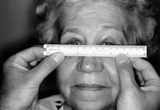 plus some specialized evaluations that are pertinent to orbital disease. ROUTINE Vision The vision is an integral part of any orbital examination. Visual acuity provides an indicator of the extent of orbital disease, and decreased vision suggests involvement of the optic nerve or globe. Vision gives a baseline from which to measure progression of disease and is a medical-legal necessity. This is even more important in patients presenting with orbital trauma. It is vital to perform a visual acuity examination before taking trauma patients to surgery even if this requires using a Desmarres retractor to open the swollen eyelids. Nonophthalmic surgeons who are called on to operate for trauma in the orbital area frequently neglect this vital part of the orbital examination. Pupils Examination of the pupils is very important and may provide information about the underlying orbital condition. The small pupil of a Horner's syndrome may be the clue that one is dealing with a pseudoenophthalmos. The large pupil of a third cranial nerve palsy indicates that the associated diplopia is due to a paralytic abnormality as opposed to a restrictive phenomenon. The presence of a relative afferent pupillary defect is confirmation that the optic nerve is compromised by orbital disease, even though many patients have an optic nerve head that appears normal on funduscopic examination. Extraocular Movements The cross cover test is invaluable for assessing ocular position in primary position, upgaze, downgaze, right gaze, and left gaze. In most orbital disorders the deviation will vary in different positions of gaze. The nonconcomitance of strabismus associated with orbital disease helps to distinguish it from other common forms of strabismus. It is important to note abnormal ductions because a slight limitation in one eye may be the only evidence of an abnormality and may be very useful in localizing the orbital lesion. Slit-Lamp Examination Slit-lamp examination is most useful for assessing the status of the cornea that may demonstrate exposure keratopathy caused by proptosis or lid retraction. Many orbital disorders cause dilatation of conjunctival vessels and conjunctival edema. These findings are relatively nonspecific, but large tortuous conjunctival veins may be a sign of carotid cavernous fistula. Intraocular Pressure Intraocular pressure may be elevated in patients with orbital disease, through a variety of mechanisms. Carotid cavernous fistulas cause an increase in episcleral venous pressure and, therefore, impede aqueous outflow. Mass lesions may press directly against the globe, especially when a retrobulbar hemorrhage causes a sudden expansion of the mass. Restriction of the extraocular muscles, such as may occur with blowout fracture or thyroid eye disease, produces a factitious elevation of intraocular pressure when the eye attempts to rotate against the restricted muscle. In cases of mild thyroid eye disease, the progressive increase in intraocular pressure with elevation of the eye may help to confirm the diagnosis. Fundus Examination Fundus examination is important to assess the optic nerve. Tumors may compress the optic nerve, causing disc edema or optic atrophy. Optic nerve meningiomas may produce shunt vessels on the disc. Choroidal striae may be noted if a mass is indenting the globe. On occasion intraocular tumors may extend through the sclera into the orbit, and the correct diagnosis is made when the intraocular tumor is identified. Color Vision Assessment of color vision is an important test for optic nerve dysfunction, although one must be careful not to attribute optic nerve dysfunction to patients who have a congenital abnormality of color vision. Sophisticated tests for color vision measurement, such as the Farnsworth-Munsell test, are not generally required for clinical assessment of optic nerve dysfunction. The Ishihara color plates are satisfactory for clinical use. SPECIALIZED ORBITAL EXAMINATION Inspection Inspection of the face and more specifically the periocular adnexa is the simplest of all examinations and yet this inspection is frequently overlooked by neophyte examiners. It is important to look at the entire face to get a sense of the facial proportion and symmetry. Globe Displacement Globe displacement (horizontal or vertical) does not always result in diplopia. Even so, patients may present with the complaint that the eye does not “look right.” It is important to determine whether the apparent displacement of the globe is real or illusory. Posttraumatic telecanthus or large congenital epicanthal folds may create the false impression that eyes are displaced medially. Tripod malar fractures may produce a displacement of the lateral canthal complex and the illusion that the eye is abnormally positioned, when the true anatomic abnormality involves the zygoma and eyelids. Vertical displacement of the globe is frequently seen after blowout fractures or orbital decompression. Orbital roof fractures or tumor masses present in the superior orbit may cause the globe to be displaced inferiorly. This displacement may or may not be associated with ipsilateral ptosis and/or decreased supraduction. The horizontal position of the globes is measured from the center of the bridge of the nose using a ruler to determine the distance from the midline to the center of the pupil (Fig. 1). Previous trauma or surgery to the nose may make this measurement unreliable. Vertical displacement of the globe is evaluated by placing a ruler in a horizontal position across the bridge of the nose. The relative positions of the globes may be assessed and the vertical displacement can be either measured or estimated in millimeters. Once again significant trauma to the midface renders this measurement inaccurate.