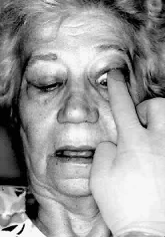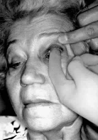 Color The color of the eyelids may provide a clue to the underlying orbital pathology. In many cases there will be no discoloration of the eyelids. However, inflammatory lesions often cause an erythema of the eyelids. This redness may be associated with edema and tenderness. Bruising of the eyelids is most frequently seen following trauma but may be associated with hemorrhage into an underlying orbital lesion. Spontaneous hemorrhage most frequently occurs with lymphangioma and hemangioma but may be seen with other tumors, such as childhood neuroblastoma. Lymphangiomas and deep seated hemangiomas have a bluish tint. More superficial vascular lesions are red or maroon. Pulsations Pulsation of the eyelids and orbital contents is an infrequent finding and may be easier to appreciate with palpation rather than visual inspection. Pulsation is most commonly seen in neurofibromatosis, in which the absence of sphenoid bone allows brain pulsations to be transmitted to the orbital contents. Extremely vascular tumors may occasionally pulsate because of the high blood flow in these lesions. Palpation Palpation of the orbit is a simple maneuver that often provides important information. The upper and lower eyelids should be palpated gently. It is possible to insert the tip of a small finger between the globe and the orbital rims on all four sides so that the anterior orbital contents may be palpated. In this way abnormalities of the lacrimal gland or the lacrimal sac can be identified, and abnormalities of the orbital rim are easily appreciated. This technique is especially useful for trauma patients who may have a step deformity of the orbital rim. Retropulsion of the globes is a test that has received considerable attention. This test is performed by placing the fingers over both eyes and gently pushing them in a posterior direction. A firm lesion present behind the globe will resist retropulsion and this sensation is palpable. Unfortunately, this test is nonspecific and has little diagnostic value. Digital examination of the superior fornix is a particularly useful technique for evaluating superior orbital lesions. To perform this examination the conjunctival sac is anesthetized with a topical agent. A gloved finger is gently inserted behind the upper eyelid into the superior fornix (Fig. 2). The finger is moved medially and laterally and anteriorly and posteriorly to palpate any lesions present in the superior part of the orbit. Bimanual palpation is sometimes helpful (Fig. 3). It is useful to have the patient look down during the examination because this position is more comfortable. In addition, downward rotation of the globe will sometimes bring an orbital mass more anteriorly so that it may be more readily palpated. Small orbital rim fractures may also be identified in this way. Lacrimal gland abnormalities may be easily palpated. This technique is particularly useful if the upper eyelid is swollen, making palpation of the orbital mass through the eyelid difficult. The same technique may be used in the inferior fornix.