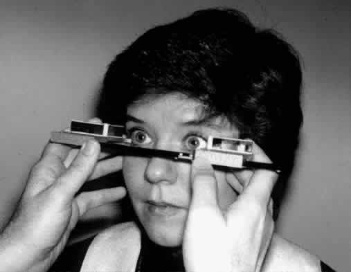 Sensation The first and second divisions of the trigeminal nerve provide sensation to the face in the orbital area. The ophthalmic branch provides sensation in the forehead, upper lid, and globe, whereas the maxillary division via the infraorbital nerve gives sensation to the cheek and upper lip. Sensation is usually tested by touching these areas with a wisp of cotton and asking if the patient is able to feel the touch. It is useful to compare one side to the other because the sensory deficit is incomplete in many cases of orbital disease. Hypoesthesia of the cheek and lip is a typical finding in patients with blowout fractures because of injury to the infraorbital nerve as it travels through its bony canal in the orbital floor. Exophthalmometry Exophthalmometry is an accurate technique for the measurement of proptosis. This measurement may be accomplished in several ways, but in each case the reference points are the lateral orbital rim and the apex of the cornea. The generally accepted normal value is less than 22 mm. However, there are some patients without orbital disease who have exophthalmometry readings greater than 22 mm. The absolute value of the exophthalmometry reading is less important than the difference between the two eyes. The left and right measurements should not differ by more than 2 mm. Exophthalmometry may be performed with a Hertel type of instrument. This instrument rests against the lateral orbital rim and the position of the corneal apex is measured by means of mirrors (Fig. 4). Frueh has shown that inexperienced examiners give less reliable measurements than experienced examiners.19