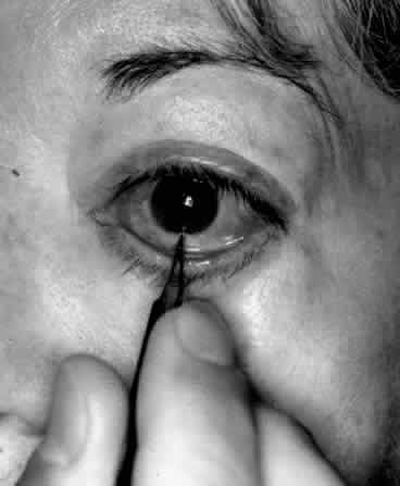 Although the Hertel exophthalmometer is the most widely used instrument, exophthalmometry readings may be obtained by simply placing a transparent ruler on the lateral orbital rim and measuring the position of the cornea. Inspection from behind the patient looking over the forehead down onto the proptosed globes is also a way to estimate proptosis (Fig. 5).