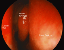 Forced Duction Test The forced duction test is a useful test for distinguishing paralytic strabismus from restrictive strabismus. The forced duction test is used to detect an inelastic extraocular muscle that prevents the globe from rotating. For example, a tight inferior rectus muscle will not allow the globe to rotate superiorly. The test is carried out by placing topical anesthetic into the conjunctival sac. The globe is grasped with a pair of toothed forceps at either the limbal area (where Tenon's capsule is tightly adherent to the globe) or the insertion of the extraocular muscle, and an attempt is made to “force” the globe to rotate in the desired direction (Fig. 6). Restriction may be felt when the globe reaches the end of its “tether.” (For some patients, especially in the pediatric age group, application of the forceps to the globe is too frightening or painful. In these situations the forceps may be replaced with a cotton swab and the globe gently pushed.) The forced duction test is particularly useful for differentiating between a medial wall blowout fracture with medial rectus entrapment and a sixth cranial nerve palsy. Auscultation Auscultation of the orbit will detect bruits. Orbital bruits are generally due to high flow, high-pressure carotid cavernous fistulas, or in some cases high-flow arteriovenous malformations. The examiner must be careful to ensure that the fellow eye remains in primary position during auscultation because ocular movements behind the closed eyelid cause noise that can be readily heard through the stethoscope. Nasal Examination Nasal examination is a useful technique for the orbital surgeon because nasal or sinus inflammation and tumors sometimes have an orbital presentation. The nasal mucosa is anesthetized and decongested with 5% cocaine spray (or something similar). When the nasal speculum is inserted into the nose it is helpful to hold the external naris with the index finger to stabilize the speculum. Nasal visualization is carried out by means of the time-honored center-hole head mirror. However, the indirect ophthalmoscope is an excellent tool for looking into the nose and gives the examiner the added advantage of binocularity (Fig. 7). Nasal endoscopy is another excellent way of examining the nose. The nose is similarly prepared and the endoscope is placed into the nostril. Visualization is much easier using a camera and monitor than looking directly though the endoscope. In addition, photographic documentation of nasal abnormalities is possible (Fig. 8).
