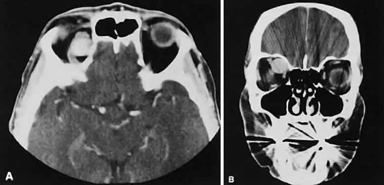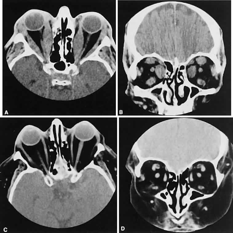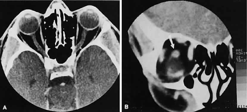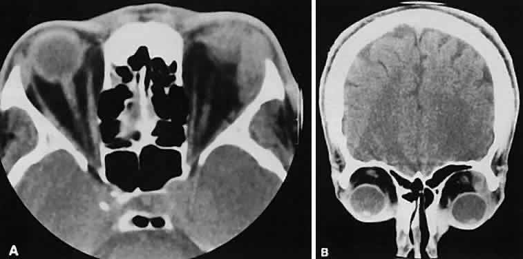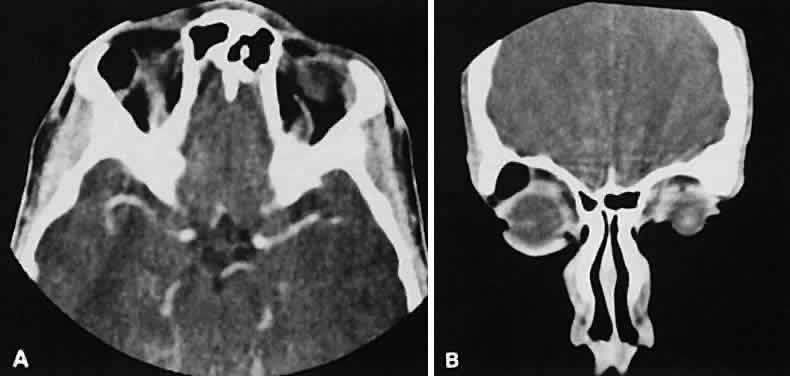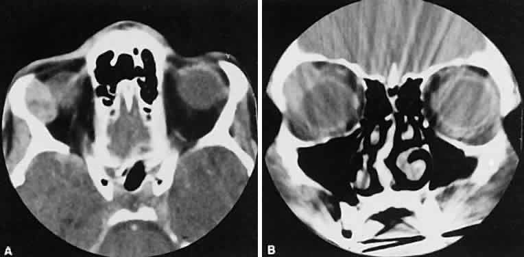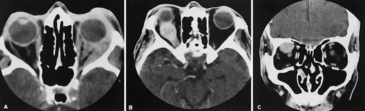 and colleagues49 suggested a differential approach based on high-resolution CT morphology. An enlarged optic nerve also is associated with an age-related differential diagnosis. Most gliomas are found in children, whereas optic nerve sheath meningiomas tend to afflict adults, primarily women. Nevertheless, there are exceptions for each. Optic nerve gliomas are associated with neurofibromatosis. A prospective study determined that a child with known neurofibromatosis has a 15% chance of having a glioma of the anterior visual pathway. Conversely, a child with an optic nerve glioma has a 25% chance of having neurofibromatosis.50 Although an optic nerve meningioma can occur in association with neurofibromatosis, particu-larly NF-2,51 the association is not as firmly established as with gliomas. It is uncommon but well-established that optic nerve meningiomas can occur during childhood. Not only can they create confusion regarding differentiation from optic nerve glioma, but, most important, they behave in a more aggressive fashion.52 The CT evaluation of optic nerve lesions is facilitated by the use of 1.5-mm axial slices and intravenous contrast.49 Gliomas usually appear as a fusiform enlargement with sharp delineation from the surrounding tissue due to circumscription by an intact dura (Fig. 10). Kinking and buckling of the optic nerve along with infarctive cysts are typical findings in an optic nerve glioma. Bilaterality and intracranial involvement of the anterior visual pathway also may be noted. The radiographic signature of an optic nerve meningioma is more variable (Fig. 11). The optic nerve shadow tends to be diffusely enlarged, with irregular expansion along the optic nerve. Jakobiec and colleagues53 found diffuse enlargement of the optic nerve with apical expansion to be the most frequent pattern. Calcification within the optic nerve shadow, which is unusual in optic nerve gliomas, is common with optic nerve meningioma. The irregular excrescent margins most likely signify extradural invasion into the adjacent orbital soft tissues. A central linear lucency extending the length of the optic nerve shadow also is a typical finding of an optic nerve meningioma.49 These two lesions represent the most frequent tumors affecting the optic nerve. Other reported tumors include hemangioblastoma, leukemic infiltration, and involvement by metastatic disease. Enlargement of the dural sheath around the optic nerve, an optic nerve meningocele, can be confused with a tumor.54 The radiographic procedure of choice for evaluating suspected optic nerve lesions is MRI with gadolinium and high-resolution, fat-suppression techniques. ORBITAL TUMORS In a patient with an orbital mass, CT can show not only the mass but also other valuable information such as shape, location, consistency, intralesional calcium, and effect on surrounding structures.55 Contrast enhancement offers some ideas about vascularity. VASCULAR TUMORS The vascular tumors under consideration are capillary hemangioma, cavernous hemangioma, lymphangioma, and hemangiopericytoma. Capillary hem-angiomas and lymphangiomas are benign infiltrativetumors seen in a pediatric population. Capillary hemangiomas have a homogeneous consistency, display intense uniform contrast enhancement, and do not usually displace any orbital structures (Fig. 12). Phleboliths are a characteristic finding in hemangiomas and, when present, are virtually pathognomonic of this diagnosis.56 Lymphangiomas have a cystic component, which, on occasion, may hemorrhage into itself, accounting for rapid onset of symptoms and clinical/radiographic evidence of mass effect (Fig. 13). In all likelihood, scans require sedation for an adequate study. Thin (1.5-mm) axial views with computer reformatting for coronal views along with contrast enhancement should provide an adequate study.