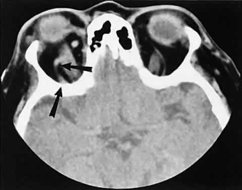 also is less radiation exposure. Direct coronal views (3-mm) by themselves, without contrast, probably give the most information about the orbit in a trauma evaluation. Subtle nondisplaced fractures can be seen, and soft-tissueentrapment also may be appreciated (Fig. 22).Blowout fractures of the floor and medial wall are straightforward in their radiologic assessment. Rounding of the inferior rectus muscle can be a helpful radiologic clue to the presence of a floor fracture if the fracture itself is not seen on the scan.75 “Blow-in” fractures of the roof need to be scrutinized carefully for frontal sinus fractures and pneumocephalus, which, if untreated, could lead to a cerebral abscess.76,77