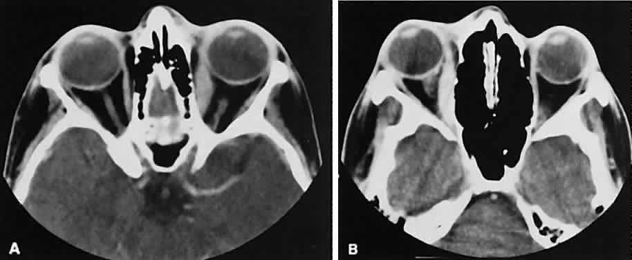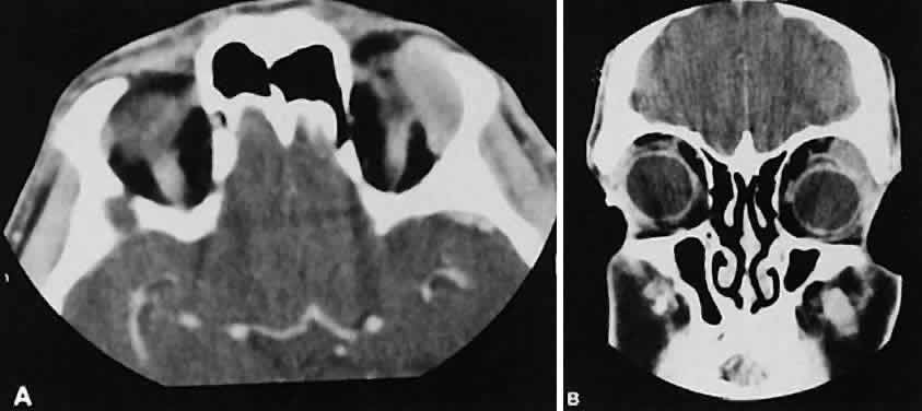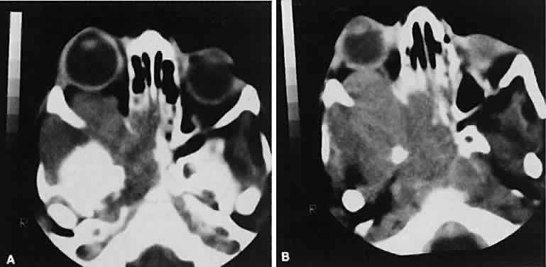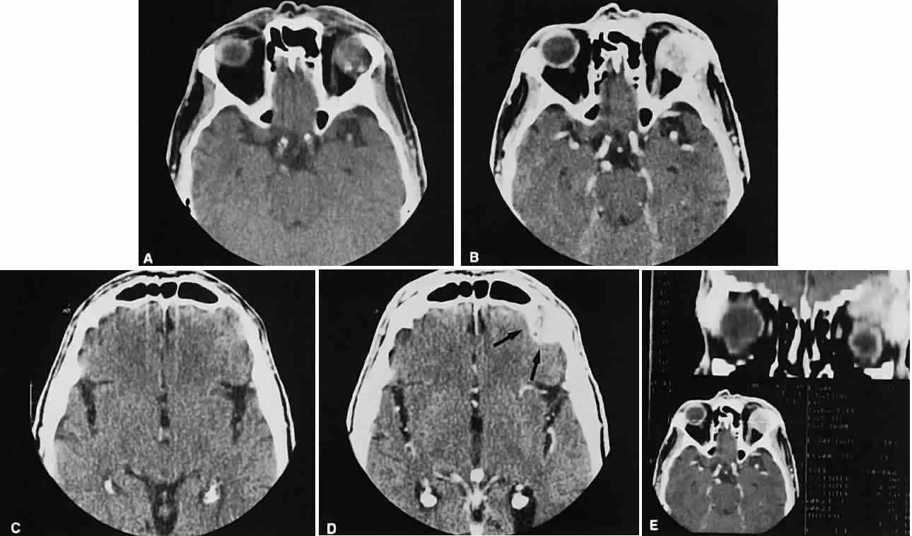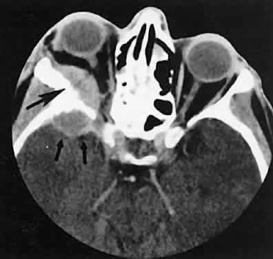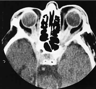 cavernous sinus or sinuses, which appear engorged and opacified. Harris48 related the clinical course of patients with subperiosteal abscesses to their CT scans. The sub-periosteal material could not be predicted from the size or the relative radiodensity of the collections on the scan. Serial scans also showed enlargement of the abscess during the first few days of intravenous antibiotic therapy, regardless of the ultimate response to therapy. |
