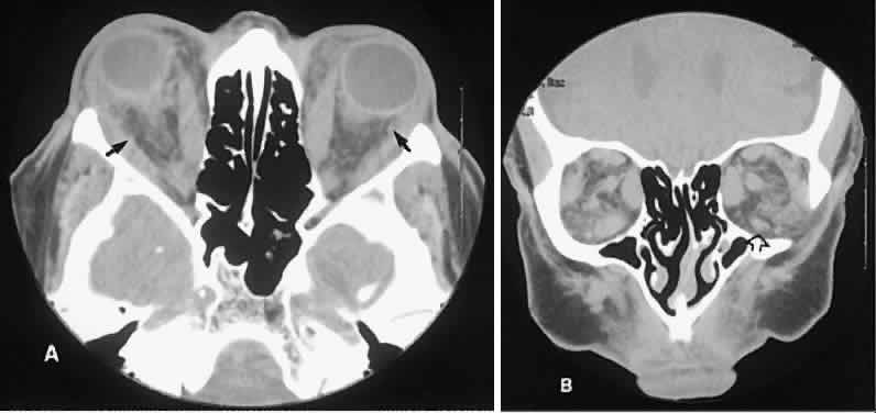 EOM is invariably enlarged. Less often, orbital infections may be transmitted