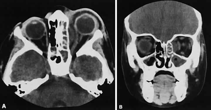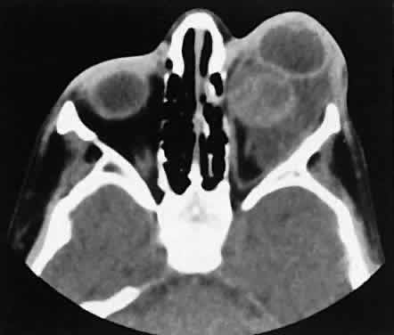 NEUROGENIC TUMORS In addition to the schwannoma and the isolated neurofibroma mentioned in Table 3, the remaining neurogenic tumor of importance is the plexiform neurofibroma. It is the most common peripheral nerve sheath tumor and is a feature of neurofibromatosis. It diffusely infiltrates all the orbital structures and can be associated with an ipsilateral absence of the greater wing of the sphenoid, glaucoma, and enlarged EOMs. Although CT cannot allow unequivocal presurgical diagnosis, it is certainly suggestive and can facilitate biopsy.57 MESENCHYMAL TUMORS The prototypical mesenchymal tumor is the rhabdomyosarcoma. Clinical evaluation of a child with acute or subacute proptosis includes a CT scan, which shows a homogeneous isodense infiltrative process with little or no contrast enhancement (Fig. 15). Bone destruction and invasion of extraorbital compartments also may be seen.58,59 Other disease processes also must be considered, such as nonspecific inflammation, retained foreign bodies, cellulitis, inflammation associated with a ruptured der-moid, neuroblastoma, chloroma, or lymphangioma.60Most entities on this list can be ruled out using radiography, but a tissue diagnosis is ultimately required.