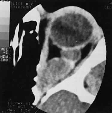 Other lesions in the lacrimal fossa include eosinophilic granuloma, seen especially in children with complaints of local pain and swelling. Radiographically, a soft-tissue mass with adjacent bone destruction may be evident.65 Hematic cysts (cholesterol granuloma), a residual of remote trauma, also can be associated with bone destruction in the lacrimal fossa. Evidence of mass effect also is invariably present. MRI may prove more efficacious in detecting old blood and evaluating these lesions.66 Dermoid cysts are located most frequently in the superior temporal quadrant of the orbit. They may be located anywhere within the orbital confines. Lesions in the lacrimal fossa or along the posterior lateral wall may communicate intracranially or into the temporalis fossa. Radiographically, the cysts are well-delineated and have lucent interiors with CT attenuation densities in the fat range (Fig. 19). Calcification along the rim of the cyst may be present. The bony changes have irregular, notched borders rather than the moth-eaten appearance associated with malignancy. The range of CT appearances can be quite wide.67