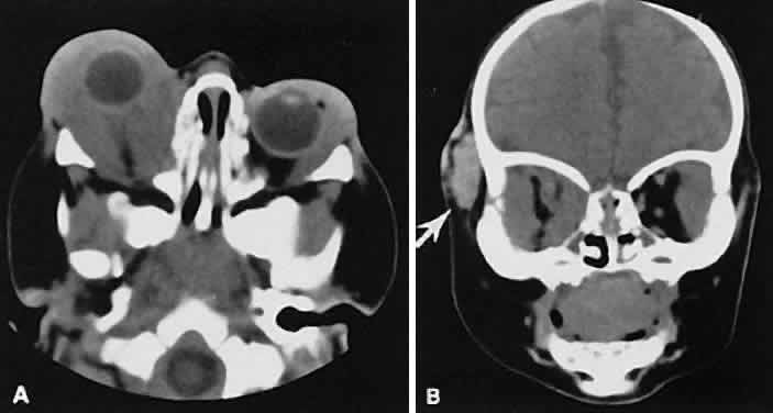 As the sensitivity and resolution of CT scanning has increased, its utility in the evaluation of the globe itself has increased.1 Children with leukocoria and in whom the diagnosis of retinoblastoma is suspected can be scanned, looking for the characteristic intraocular focal appearance of calcification.78 Incidental asymptomatic calcification was evaluated in a series of 100 patients.79 Bilateral drusen of the optic nerve were seen in 2%, calcified scleral plaques located anterior to the lateral and medial rectus insertions were seen in 3%, and bilateral ossification of the trochlea were seen in 3%. Trauma evaluations, specifically looking for evidence of a ruptured globe or foreign bodies, are now quick and reliable.72,74 |