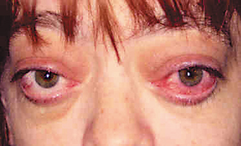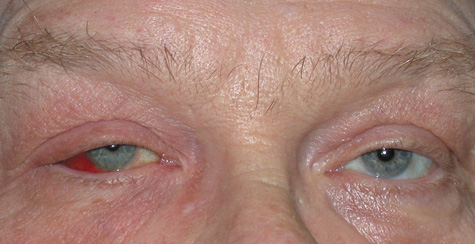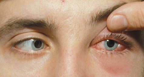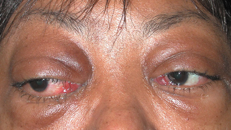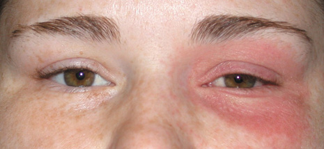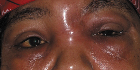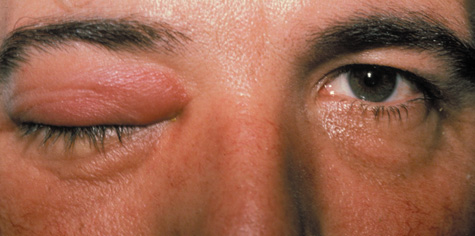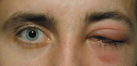 Antecedent and significant past medical history may include a history of headache, rhinitis, sinusitis, polyposis, nasal discharge, anosmia, or recent upper respiratory tract infection. The patient may give a history of prior orbital fracture or orbital fracture surgery with implantation of alloplastic materials. Scleral buckling procedures and strabismus surgery have been noted to cause orbital cellulitis; thus, the patient should be queried regarding prior ophthalmic surgery.38–40 The patient may also give a history of recent dental work, specifically dental extractions.42 The patient may have had prior surgery of the eyelids or of the facial skeleton with insertion of wires, rigid internal fixation (miniplates), alloplastic plates, or nondissolving suture material.34 Pain is not invariably present. It is notably absent in approximately 40% of cases, even those presenting with abscess.25 Fever is a nonspecific sign. In the presence of purulent sinusitis, pain may be present when the affected sinus is palpated; and with ethmoid sinusitis, pain may be elicited with pressure on the inner canthus. The sinus may not transilluminate. Mucopurulent rhinorrhea may be present, and the ophthalmologist when possible should look in the nose or seek the opinion of an otorhinolaryngologist. Proptosis, chemosis, and extraocular motility deficit are the clinical hallmarks of orbital cellulitis (see Fig. 6). Visual acuity decrease, pupillary signs, and vision loss may occur rapidly. Rarely, if sphenoid sinusitis occurs in isolation, the patient may present with atypical optic neuritis without proptosis or with little in the way of superficial cellulitis.48 Optic neuropathy, with the associated pupillary finding of a relative afferent pupillary defect and optic nerve head findings such as optic disc edema, may be observed. As orbital pressure increases, patients can show signs of retinal and choroidal arterial and venous stasis with congestion and a picture resembling chronic vein occlusion or central retinal artery occlusion. Hypesthesia of the nasociliary or frontal nerves is rarely seen. Hypotony, choroidal folds, and anterior segment inflammation with hypopyon can occur and imply intraocular spread. A dilated nonreactive pupil implies third nerve involvement. Patients may show signs of third, fourth, or sixth nerve involvement when the infection extends into the orbital apex. Subperiosteal abscess formation most often is diagnosed on neuroimaging and is indistinguishable clinically from orbital cellulitis. Signs of an abscess include displacement of the globe away from the affected sinus and limitation of abduction and adduction,24 but these signs can occur with orbital cellulitis as well. Intraorbital abscess formation can present in the patient who has been partially treated for an orbital infection and may present as proptosis or globe displacement without any infectious signs or as orbital cellulitis.25 If infection spreads posteriorly through the superior orbital fissure to involve the cavernous sinus, additional signs may supervene. Signs of cavernous sinus thrombosis include headache, ipsilateral hypesthesia from involvement of the ophthalmic and maxillary division of the trigeminal nerve; third, fourth, and sixth cranial nerve palsies; and mental status changes from confusion to obtundation. The contralateral side may develop cranial nerve signs, periorbital edema, or cellulitis (Fig. 9). DIFFERENTIAL DIAGNOSIS Several conditions can mimic orbital and periorbital cellulitis. Most of these present as the same constellation of symptoms and signs and often can have a similar appearance on neuroimaging. PRESEPTAL CELLULITIS Conditions that may masquerade as preseptal cellulitis include allergic edema of the eyelids, severe blepharoconjunctivitis, dacryoadenitis (Fig. 10), trauma, thyroid eye disease (Fig. 11), leukemic infiltrates,49 blepharochalasis syndrome, and autoimmune inflammatory disorders such as lupus.