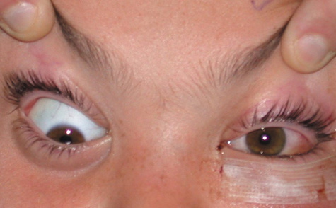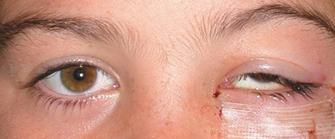 ORBITAL CELLULITIS Conditions that may mimic orbital cellulitis include thyroid eye disease, idiopathic inflammatory orbital pseudotumor (Fig. 12), orbital myositis,50 orbital abscess,51 ruptured dermoid cyst, necrotic intraocular melanoma or retinoblastoma,52,53 orbital trauma, orbital foreign body, orbital vasculitis, Wegener's granulomatosis, herpes simplex or zoster (Fig. 13), and carotid cavernous fistula. Acute-onset proptosis with inflammatory signs in a child always should alert the clinician to the possibility of rhabdomyosarcoma (Fig. 14).