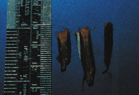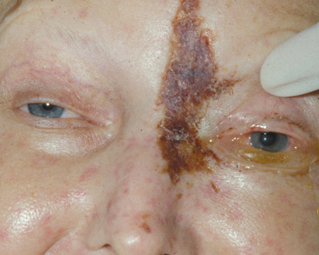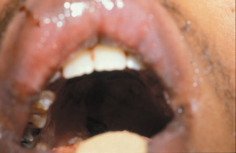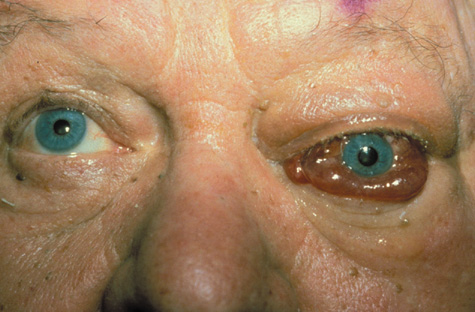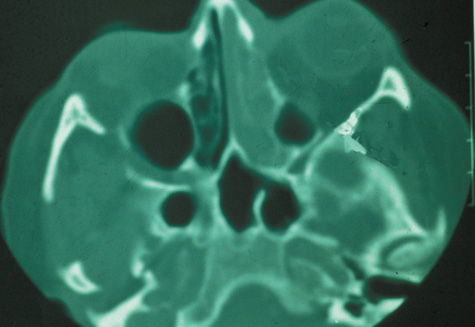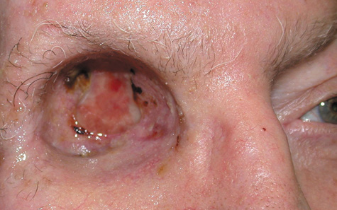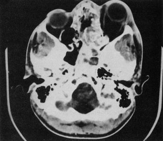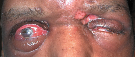 Biopsy of tissue within the orbit shows invasion of the mucosa, submucosa, and bone in cases of invasive fungal sinusitis or a granulomatous reaction without mucosal or bone invasion in the noninvasive form. The material within the sinuses may be yellowish, black, or friable. Hyphae are not seen within the mucosa or bone of patients with the noninvasive form but can be seen on routine stains of mucus. Multiple specimens should be examined116 in a search for septate fungal hyphae of relatively uniform width that are apparent on hematoxylin and eosin staining. The most common effects on the orbit are cellulitis, proptosis, ptosis, and diplopia. Invasion in both forms may produce pain. Optic nerve involvement is rare. The orbit may be affected by contiguous spread from the sinuses, usually the ethmoid. The treatment for aspergillosis in the immunosuppressed patient is both medical and surgical, with anjpgungal agents (usually amphotericin B) and radical debridement and sinus surgery.106,107,111 Flucytosine and rifampin with amphotericin B may be more effective than amphotericin alone.117–119 Conservative debridement, intravenous amphotericin, and local amphotericin irrigation have been described as an alternative to radical surgery.99 Five milliliters of amphotericin B is placed in sterile water, creating a concentration of 0.25 mg/mL. Irrigation is performed two times a day directly into the orbit through a site of entry into the orbit or sinus.116 MUCORMYCOSIS Mucormycosis is a fungal infection with the organisms from the genera Mucor, Absidia, and Rhizopus100–102 that normally are present in air, soil, vegetable matter, skin body orifices, manure, and bread mold.120 Most patients who develop mucormycosis have a predisposing systemic disease: Typically the infection occurs in the diabetic patient with ketoacidosis, but it can occur in patients with renal failure, gastroenteritis, or in those who are immunosuppressed.121 Rarely, it can occur in the normal host.124,125 An association between deferoxamine therapy for iron or aluminum excess and mucormycosis has also been described in hemodialysis patients with chronic renal failure, as well as in a variety of hematologic disorders.126 It is possible that the fungus uses the iron that is mobilized by deferoxamine to proliferate, thus facilitating invasive infection.126 Rhinocerebral mucormycosis originates as a rhinitis, parapharyngitis, or sinusitis, and spreads by invasion of blood vessel walls, causing a necrotizing vasculitis with thrombosis of the vascular lumina and resultant infarction. The patient typically presents with unilateral orbital apex syndrome, including severe pain, visual loss, total ophthalmoplegia, corneal anesthesia, and multiple cranial nerve palsies.127 Orbital cellulitis presenting with early visual loss is one of the hallmarks of mucormycosis.72 Gangrene may occur of external periorbital tissues as well as of the hard palate and nose, and eschar-like crusting may be observed within the nose or on the hard palate (Fig. 23). Obstruction of the central retinal artery, ciliary arteries, and choroidal circulation can also be seen.124,125 Brain damage may occur because of spread of infection or infarction or occlusion of affected intracranial vessels.72