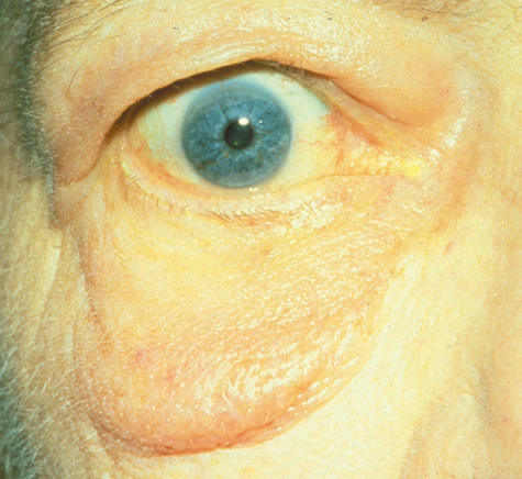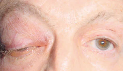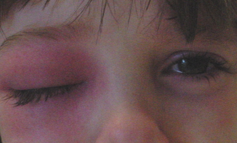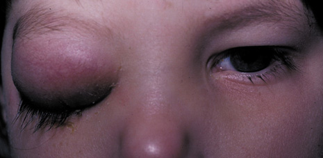 PRESEPTAL CELLULITIS Patients with preseptal cellulitis often present with a short history of painless swelling of the eyelids. A history of previous upper respiratory tract infection, trauma, insect or animal bite, conjunctivitis, or chalazion may be elicited. Fever is an inconstant feature but may be present in approximately 62% of cases.12 The eyelid characteristically is erythematous and edematous and may show signs of the trauma, bite, or chalazion that initiated the cellulitis (see Fig. 1). The eyelid may be painful to palpation. The superficial spreading cellulitis is confined to the eyelid and delimited by the attachments of the orbital septum to the arcus marginalis of the orbital rim so that infection will extend to this area and not beyond. Rarely, the etiology of the eyelid infection may be diagnosed clinically. Necrotizing eyelid cellulitis may be caused by erysipelas, an infection with a group A β-hemolytic Streptococcus, and can give rise to lid necrosis (Fig. 7).44,45 H. influenzae produces a characteristic nonsuppurative preseptal cellulitis with a purplish discoloration of the eyelids.46 Staphylococcal species may cause a suppurative cellulitis with abscess formation.