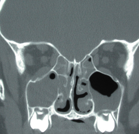 Prior to the Haemophilus influenzae type b (Hib) vaccine, the most common clinical presentation was of a child younger than the age of 36 months with a history of antecedent upper respiratory tract infection, otitis media, and bacteremia and usually resulted from infection with Hib.4 However, since the introduction of the Hib vaccine, the incidence of Hib induced preseptal cellulitis has declined dramatically with some studies reporting up to a 90% reduction.15 Orbital cellulitis, in contrast, usually arises from spread of infection from the paranasal sinuses. Orbital involvement occurs in 0.5% to 3% of patients with acute sinusitis.14 In a large series of patients with orbital cellulitis, sinusitis was responsible for orbital infection in 75% to 90% of cases.8,18,19 The ethmoid sinus is the most commonly implicated sinus in infections that spread to the orbit in children; the frontal and sphenoidal sinuses do not develop until age 7.20 In adults, pansinusitis often is associated with orbital cellulitis and spread is believed to occur through the ethmoid or frontal sinuses. In addition to anatomic proximity, several other factors predispose the orbit to the spread of contiguous sinus infection. Dehiscences often are present in the orbital walls, particularly in the thin-walled lamina papyracea.21–23 As a consequence, pus or transudate may rupture through the thin-walled lamina into the orbit and result in subperiosteal abscess formation. This theoretical mechanism is consistent with the observation that most abscesses occur in the medial orbit, adjacent to the ethmoidal sinuses.24–26 Posteriorly, the optic nerve within the optic canal is adjacent to the lateral wall of the sphenoidal sinus. Dehiscences can also be present in the lateral wall of the sphenoidal sinus along the optic canal, in approximately 6% of cases.27 Another factor predisposing the orbit to the spread of adjacent sinus infection is the free vascular communication between the orbit and the sinuses. The orbital veins are valveless, and flow occurs in either direction28 through the anterior and posterior ethmoidal foramina. Increased pressure within the sinuses caused by obstruction to mucus outflow in sinusitis may hamper venous drainage and manifest as the eyelid edema that accompanies acute sinus inflammation. Septic thrombophlebitis can also occur within these vessels and allow bacterial spread into the orbit.29–33 However, all orbital cellulitis resulting from sinus disease is not secondary to acute sinusitis. Orbital fracture can spread existing chronic sinus infection into the orbit (Fig. 2).25,31–33 Mucoceles, slowly enlarging mucus-filled cysts within the sinuses that enlarge by pressure erosion of adjacent orbital and intracranial structures, can become infected and result in mucopyoceles that cause both cellulitis and abscess formation.34–37 Approximately 15% of orbital cellulitis occurs from other sources.8 In particular, dacryocystitis is sometimes associated with a cellulitis that may spread posteriorly into the orbit (Figs. 3 and 4). 8 Infection can spread to the orbit from the eye, the teeth, the middle ear, or the face. Foreign bodies, such as wood, glass, or orbital floor implants, can cause orbital cellulitis refractory to treatment with antibiotics that requires removal of the nidus of infection (Fig. 5). Alternatively, a granulomatous reaction may develop around the foreign body or a cutaneous fistula may occur.25 Orbital infection has been described after uncomplicated eyelid, strabismus, and retinal surgery.38–40 Rarely, dental work or an infected dental cyst may cause orbital cellulitis through spread of infectious phlebitis across the pterygopalatine venous plexus.41,42 Endophthalmitis from a variety of endogenous or exogenous causes may extend extraocularly to involve the orbit. Finally, orbital cellulitis can occur secondarily from embolic spread in subacute bacterial endocarditis.2,3,12