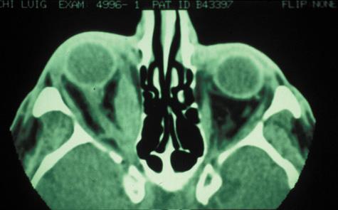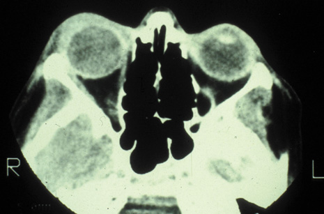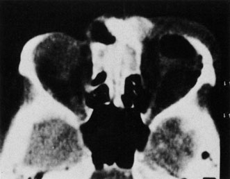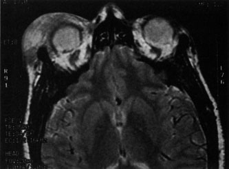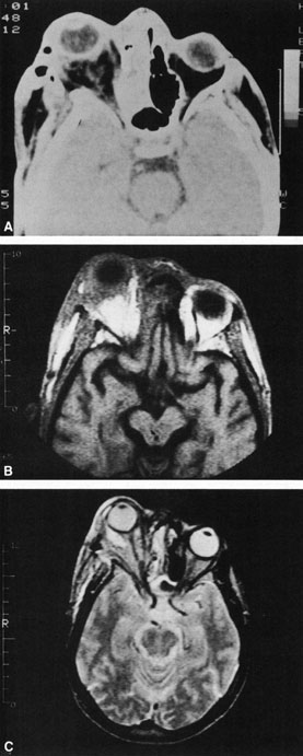 MRI may be helpful in distinguishing orbital inflammatory diseases such as orbital pseudotumor from orbital cellulitis.73 MRI is most helpful in distinguishing the diffuse orbital form of orbital pseudotumor as well as the localized inflammatory pseudotumors such as the myositis, periscleritis, and scleritis forms. The diffuse orbital form is most commonly seen on MRI as a reticular pattern with isointense signals in the orbital fat in both T1- and T2-weighted studies.73 Orbital cellulitis is best characterized by a diffuse pattern that is isointense in T1-weighted images and hyperintense on T2-weighted images.73 Both CT and MRI can also help in the planning of surgery and the evaluation of treatment efficacy. |