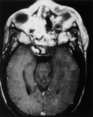 CT shows sinusitis with or without bone destruction and is indistinguishable from other causes of orbital cellulitis.128 MRI may show carotid narrowing, occlusion, and absent flow in the superior ophthalmic vein (Fig. 24).72 Diagnosis is made by having a large index of suspicion and obtaining specimens of nasal turbinate, sinus, or infected orbital tissue. Large, branching nonseptate hyphae are readily apparent on hematoxylin and eosin staining or with methenamine silver staining (see Fig. 23). These hyphae can be grown on fungal culture. The treatment of mucormycosis involves the control of ketoacidosis or other systemic disease. Sinus drainage must be restored, and intravenous amphotericin B in doses of up to 1 mg/kg per day can be administered up to a total dose of 2 to 4 g. Radical and aggressive surgical debridement of infected tissue is advocated by most authors, including exeneration if necessary. Surgical debridement is important because local thrombosis caused by fungal invasion prevents amphotericin from reaching necrotic and infected tissue. In the patient with known infection and preserved vision, the need for exenteration and radical surgery is more controversial, particularly if orbital biopsy does not show orbital invasion with fungal elements. Successful outcomes have been achieved with debridement of infected tissue without exenteration.128 In one series intravenous amphotericin has been used successfully in conjunction with local irrigation of orbital and sinus tissues with amphotericin B.129 Hyperbaric oxygen has been used as an adjunctive therapy for rhinocerebral mucormycosis by treating patients with 100% oxygen at 2.5 atm for 90 minutes for approximately 6 weeks.130 In untreated patients, rhinocerebral mucormycosis is associated with a 14% survival rate. With amphotericin B and surgery, the survival rate improves to 57%.121 This implies nonetheless that a significant number of patients will die of this disease and emphasizes the need for early diagnosis and aggressive management. |