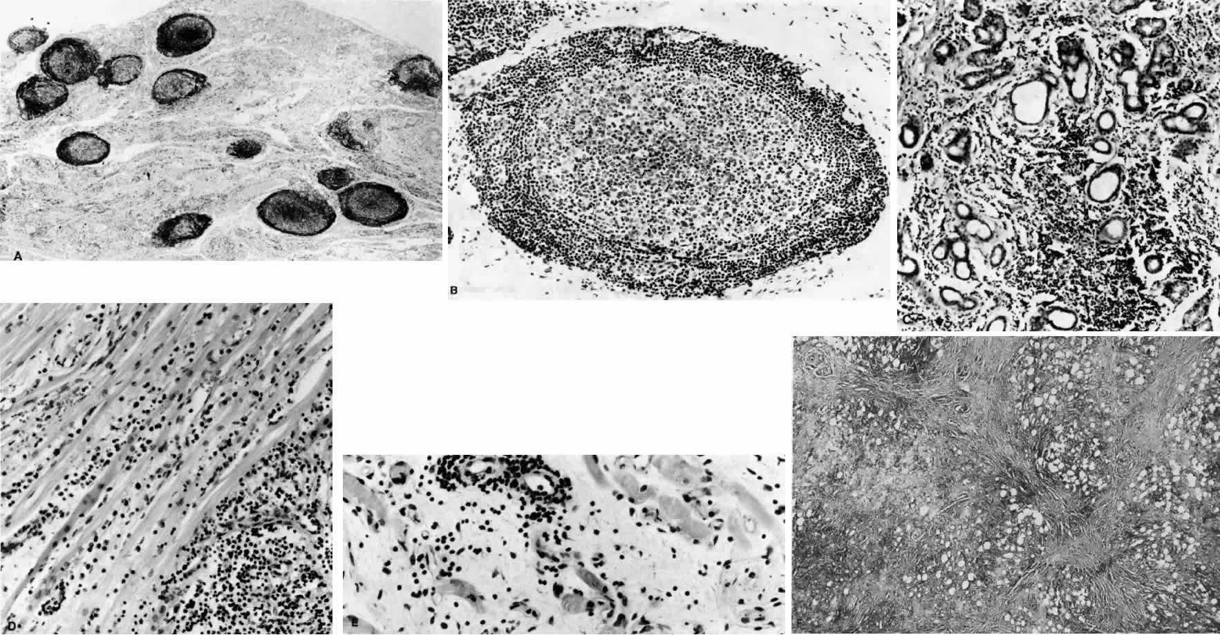 NONSUPPURATIVE NODULAR PANNICULITIS (WEBER-CHRISTIAN DISEASE) Nonsuppurative nodular panniculitis is characterized by nodular inflammation of subcutaneous fat associated with relapsing fevers, generalized weakness, arthritis, and myalgias.284–286 It is more common in middle-aged females, and lesions occur most commonly in the lower extremities. Corneal ulcers, exophthalmos, subconjunctival nodules, episcleritis, and uveitis may be associated with this disease process.287 Heparin has been used to treat the inflammatory intraocular manifestations of this condition. Laboratory Findings Laboratory features include an elevated sedimentation rate, anemia, leukopenia, and hypocomplementemia. During times of active symptomatology often there will be evidence of circulating 7S IgM or immune complexes. Death occasionally occurs due to hemorrhage and severe inflammation, with involvement of the heart, mesenteric fat, and viscera. Other diseases, including erythema nodosum, systemic lupus erythematosus, hypergammaglobulinemia, acute myelogenous leukemia, rheumatoid arthritis, sarcoidosis, and acalculous cholecystitis, may occur in patients with nonsuppurative nodular panniculitis. Intensive anti-inflammatory and antineoplastic therapy is necessary to manage this disease. Histopathology Histopathologically there is evidence of an acute inflammatory response in the fat associated with vasculitis, necrosis, and fat atrophy. Lipid-laden macrophages are common. There may be considerable fibrosis present due to recurrent inflammation. Diagnosis of this condition is based on its multifocality associated with a decreased lipoprotein lipase level. Diabetes, dermatomyositis, pancreatitis, rheumatoid arthritis, and high levels of bromide and iodide may be associated with fat atrophy. These entities usually are not associated with involvement of the orbital fat. Localized inflammation of the orbit as well as a lipogranulomatous response occurs with rupture of an orbital dermoid. However, the absence of systemic symptoms differentiates this from nonsuppurative nodular panniculitis. |