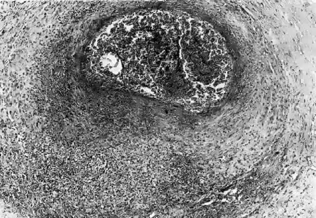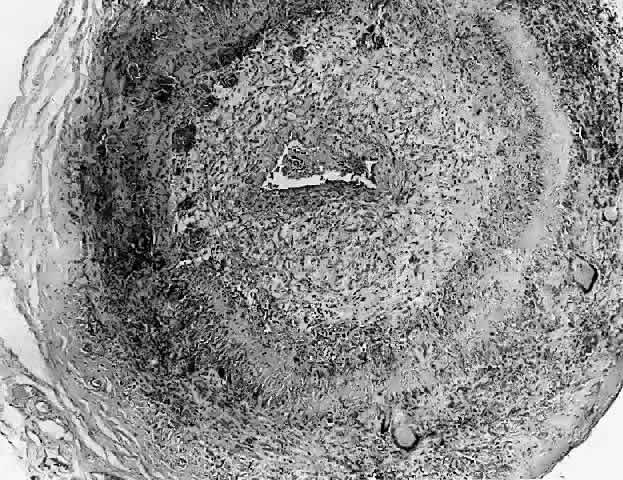with a mixture of neutrophils and nuclear dust.4 There are fibrinoid changes within the vessel walls with necrosis and