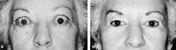 As with other thyroid eye problems, eyelid retraction may improve with time, however 55% to 60% of patients will have persistent eyelid retraction.7,91 Surgical correction of eyelid abnormalities should be performed only after orbital or extraocular muscle surgery because these operations may change eyelid position. For example, inferior rectus muscle restriction may cause upper eyelid retraction because of the superior rectus/levator palpebrae overaction against the restriction. Specific techniques for repair of eyelid retraction are discussed in other chapters. |
