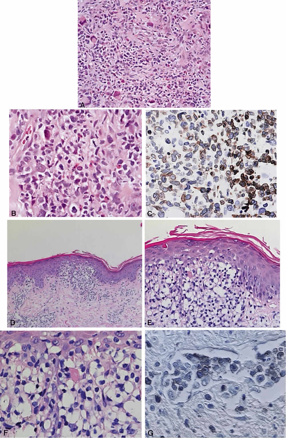 When an isolated mass of plasma cells occurs, it is referred to as a plasmacytoma, and these may occur in bone, where progression to multiple myeloma is most frequent, or extramedullary sites, which progress more rarely.100–104 Solitary conjunctival plasmacytoma requires observation for development of multiple myeloma (Fig. 16). Solitary plasmacytomas make up 3% to 5% of plasma cell tumors, and 25% of plasmacytomas have elevated IgM protein in the blood and urine. T-CELL LYMPHOMA T-cell lymphoma of the orbit is rare and usually occurs during the late stage of systemic disease or as a manifestation of mycosis fungoides. Only one case of primary T-cell lymphoma in the orbit has been described.105 Mycosis fungoides, a cutaneous T-cell lymphoma that spreads to lymph nodes and then to viscera, can invade the lids and conjunctiva, and even more rarely, the orbit106–109 (Fig. 17). Initially, the disease presents nonspecifically as an eczematous process, then to biopsy-positive indurated plaques, and then to cutaneous lesions and ulcerations, which, if large and exophytic, may appear fungal (Fig. 18). Generalized erythroderma may occur at any stage and is particularly common in Sézary's syndrome of erythroderma, hepatosplenomegaly, lymphadenopathy, and circulating abnormal T cells. Staging of the disease is done with evaluation of skin, lymph nodes, viscera, and blood. Patients with erythroderma have a worse prognosis, with a mean survival of 3 to 4 years compared with 8 years for those with plaques.110 This disease can progress to anaplastic large T-cell lymphoma.26 Histologically, the Sézary or Lutzner cell is the characteristic T-cell with a lobulated nucleus with nuclear infoldings (Fig. 19). Chemotherapy regimens used in peripheral T-cell lymphoma are the same as those used in anaplastic B-cell lymphoma, that is, vincristine, doxorubicin, cyclophosphamide, prednisone, and etoposide.110 Systemic T-cell lymphomas are treated with a host of chemotherapy regimens, and prognosis generally is much poorer than for B-cell lymphomas, with 50% survival at 5 years.