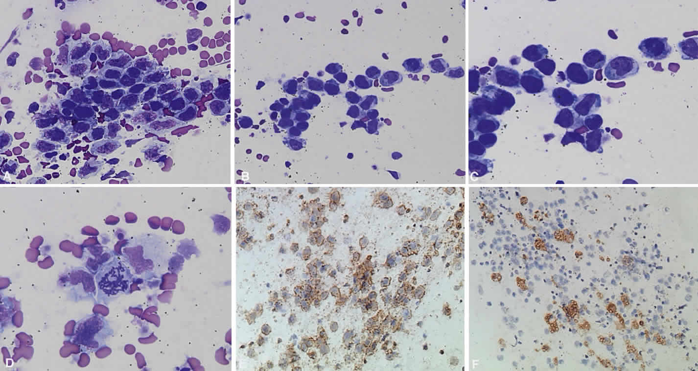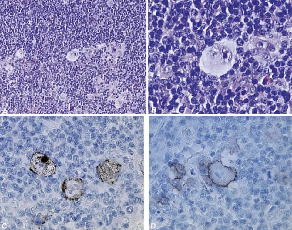 ANGIOCENTRIC LYMPHOMA (STEWART'S LETHAL MIDLINE GRANULOMA) Angiocentric lymphoma occurs over a wide age range primarily as an extranodal disease affecting the nose, lungs, upper respiratory and gastrointestinal tracts, skin, and central nervous system. Orbital involvement is rare and occurs secondary to spread from the nose. This disease was previously thought to be a granulomatous/histiocytic disorder before immunophenotyping studies demonstrated its T-cell lineage. The abnormal cells show angiocentric and angioinvasive growth patterns with local necrosis in biopsy specimens. Morphologically, the abnormal cells are polymorphic large lymphoid cells. HODGKIN'S LYMPHOMA Hodgkin's lymphoma, which constitutes 30% of all systemic lymphomas, is rare in the orbital soft tissues and lacrimal gland, and generally occurs late in the patients with widespread systemic disease.111,112 The characteristic histologic feature is the Reed-Sternberg cell, which is necessary, but not sufficient, to make the diagnosis (Fig. 20). The disease is bimodal, with an early peak at 15 to 35 years of age and a second peak after 50, and is categorized into four subtypes: lymphocytic predominance, nodular sclerosis, mixed cellularity, and lymphocytic depletion.113 Immunophenotyping studies suggest that the Reed-Sternberg cell is of B-cell origin. Hodgkin's disease often presents as lymphadenopathy involving the neck, maxilla, or inguinal lymph nodes, and the presence of fever, night sweats, and weight loss worsen the prognosis.114 The Pel-Ebstein fever, with weeks of fever followed by afebrile periods, and the nodal pain after alcohol ingestion are pathognomonic for Hodgkin's disease. Lung and liver involvement occur late in the disease, and skin and central nervous system involvement only rarely, whereas epidural masses causing spinal cord compression and generalized pruritus occur commonly. Unlike nonHodgkin's lymphoma, staging with the Ann Arbor system predicts prognosis reliably in this disease, and this is thought to be the result of the indolent and systematic spread of disease through contiguous lymph nodes.115,116 Hodgkin's disease has a good prognosis with radiation and chemotherapy.117–120 There is an increased incidence of thyroid dysfunction in patients with Hodgkin's disease, and thyroid radiotherapy is thought to contribute to the progression of the Graves' ophthalmopathy.121 DIAGNOSIS OF LYMPHOMA Although CT may be useful in localizing orbital involvement of lymphoid lesions, only biopsy can provide the definitive diagnosis. Most lymphoid lesions are anterior in the orbit and can be readily accessed for open biopsy through the upper lid or through subperiosteal exposure. A lateral orbitotomy is rarely required, and the lacrimal gland can also be accessed by the lid, unless there is concern about the possibility of pleomorphic adenoma. Various laboratory methods are available for the diagnosis of lymphoproliferative disorders. However, histopathologic examination remains the cornerstone of the diagnostic process. In some cases, histopathologic examination of a biopsy may be sufficient to make a firm diagnosis on morphologic grounds alone. More commonly, however, ancillary methods are used to raise the degree of diagnostic certainty. In common practice, immunophenotyping of the lymphoid populations contributes to the histopathologic diagnosis. Although most immunohistochemical methods previously required frozen sections, many of the diagnostic antibodies can be used on paraffin-embedded sections after antigen retrieval maneuvers.122 Indeed, a relatively restricted panel of antibodies will successfully yield the diagnosis of most lymphoid lesions. For example, most B-cell lymphomas express CD19, CD20, CD22, or CD79a. T-cell lymphomas often express CD3, CD43, or CD45RO. Extranodal marginal zone lymphoma typically expresses B-cell markers but does not express CD5, which distinguishes it from mantle cell lymphoma and small lymphocytic lymphoma/CLL, or CD10, which distinguishes it from diffuse follicle center cell lymphoma. Mantle zone lymphomas typically express cyclin D1. The abnormal follicular structures of follicle center cell lymphoma typically express CD10, as do the follicular benign counterparts, but also express bcl-2, which distinguishes them from benign reactive follicles. Anaplastic large cell lymphomas express CD30, and the cells of Hodgkin's disease commonly express CD15 and CD3026 (see Table 1). In difficult cases, the only way to firmly conclude that a lymphoid population is neoplastic is to demonstrate monoclonality. This is most readily achieved for B-cell lesions in which the demonstration of monotypic immunoglobulin production infers monoclonality. Immunochemical study for kappa and lambda light chain expression is widely used but is problematic in many laboratories. Light chain expression has been studied at the mRNA level using in situ hybridization.123 This method appears robust and easily applied to paraffin-embedded tissues but is not yet in widespread use. In some centers, especially in cases of disseminated disease, fine-needle aspiration (FNA) cytology samples can contribute to the initial diagnostic process124 (Fig. 21). Where lesions are accessible to the surgeon, radiologist, or cytopathologist, FNA biopsy can be taken in the office setting without the need for local anesthesia. For best results, the cytopathologist or cytotechnician should be present at the biopsy to ensure optimal handling of the biopsy and preparation of slides. The utility of this method depends on the availability and expertise of the pathologist, and FNA biopsies remain underused in ophthalmic practice in comparison with other surgical specialties. In some centers, it is possible to make rapid preliminary diagnoses and to apply the full range of immunophenotyping techniques and in situ hybridization for light chain expression to establish diagnosis before permanent section biopsy or in cases of emergency 