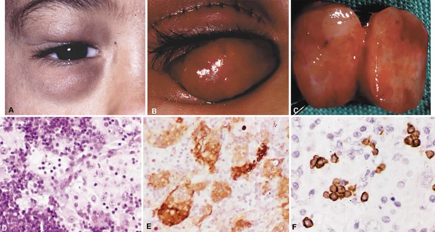 disease.53,54 Of primary orbital lymphoid lesions, 50% have been shown to be reactive or atypical hyperplasia and 50%, malignant lymphoma.55 Recent evidence, however, has shown that there is a continuous spectrum of disease in terms of prognosis, with systemic disease occurring in 15% to 25% of reactive hyperplasias, 40% of atypical hyperplasias, 20% of well-differentiated lymphomas, and 60% of poorly differentiated lymphomas.1,55–60 In addition, more aggressive lesions may develop from a matrix of benign or reactive follicles, either simultaneously or as a recurrence. Bilateral lymphoma has a high incidence of systemic involvement, although systemic disease may be indolent and may not shorten life expectancy. Lymphoplasmacytoid lymphoma has been associated with Waldenström's macroglobulinemia, a paraproteinemia which produces IgM, a heavy protein resulting in a hyperviscosity syndrome with stasis retinopathy and ischemia.26 Mortality rates at 5 years are 6% for reactive hyperplasia, 19% for atypical hyperplasia, and 58% for malignant lymphoma.1 Benign reactive hyperplasia is histologically the most innocuous of the lymphoid lesions. It is hypercellular, with sheets of mature polyclonal lymphocytes, scattered plasma cells, and histiocytes in irregular follicles associated with hyperplastic capillaries lined by plump endothelial cells and no surrounding stroma.55 The germinal center consists of dendritic follicular cells, tingible body macrophages, and large lymphocytes with mitotic figures, and is surrounded by a mantle zone of small lymphocytes. Malignant orbital lymphoma, on the other hand, often shows little mitotic activity or endothelial proliferation. Cells tend to be monomorphous, immature, and small, medium, or large with a monoclonal population exhibiting either nodular or diffuse growth. Most are low grade. Atypical lymphoid hyperplasia shares features of both benign reactive hyperplasia and malignant lymphoma, in that it lacks mitotic activity and endothelial proliferation, but does exhibit a follicular polymorphous response.55 Essentially, lesions that appear reactive, but show atypical or aggressive histological features, are grouped as atypical hyperplasia. Of malignant orbital lymphomas, 85% to 90% are diffuse, and only 10% to 15% follicular and 50% of the diffuse lesions are well differentiated.55 The follicular lesions tend to be located in orbital fat among the septa. Of the 30% of malignant lymphomas that develop systemic involvement, the extraorbital disease usually manifests within 2 years after diagnosis and, overall, approximately 50% of all orbital lymphoid lesions—reactive, benign, or malignant—are associated with subsequent systemic involvement over a 4-year follow-up.1,55 CLINICAL PRESENTATION OF ORBITAL LYMPHOMA Most orbital lymphomas are non-Hodgkin's lymphomas and tend to present in the sixth and seventh decades. Presentation before the age of 20 is rare, and, in children, orbital leukemic infiltrates are much more common than lymphoma. Most subtypes of lymphoma have a small female-to-male preponderance of 1.5:1. Lymphoid lesions usually are located superiorly and anteriorly in the orbit and present over several months with gradual painless proptosis of 5 mm or less, without conjunctival chemosis or injection (Fig. 5). There may be only mild dysmotility or displacement of the globe, since, with the exception of orbital fat, lymphoid lesions tend to mold around rather than infiltrate preexisting structures. Involvement of the extraocular muscles has been described and, when it occurs, most commonly involves the superior rectus-levator complex.61 Visual loss is uncommon, and bilateral blindness is rare.62 The lacrimal gland is involved in 30% of lesions, and this may be expected, since there are native lymphocyte populations in the lobules. Lymphoma involving the lacrimal gland feels rubbery to palpation and may have a nodular consistency, which likely results from lobular remnants of the gland. Lymphoid lesions localized to the epibulbar tissues, referred to as “salmon-patch” lesions because of their pink fleshy color, are freely mobile and may be isolated or extend posteriorly into the orbit (Fig. 6). Lymphadenopathy may be palpable and may indicate the presence of systemic disease. Of 117 patients reported by Knowles and Jakobiec, 64% of lesions were in the deep orbit, 28% subconjunctival, and 8% in the eyelid.60
