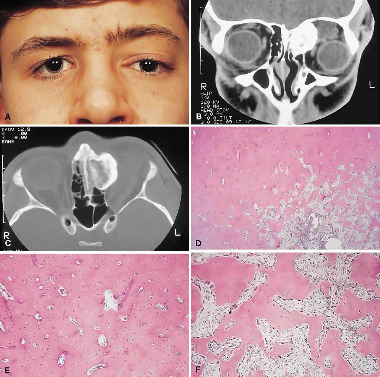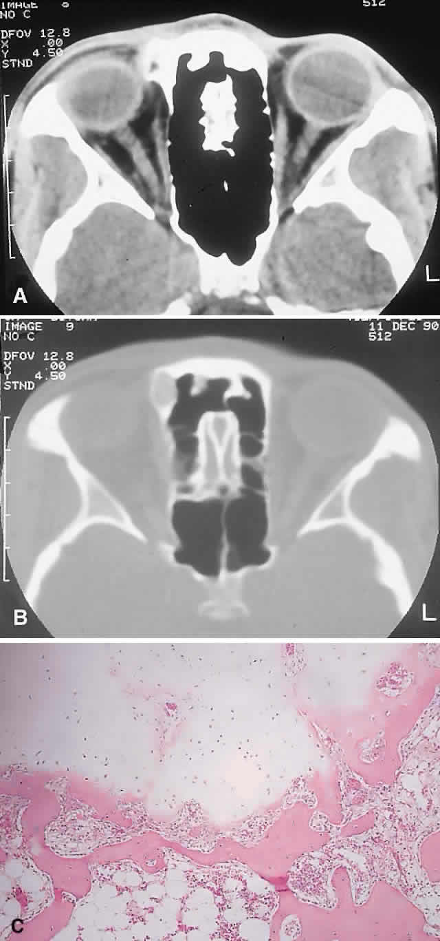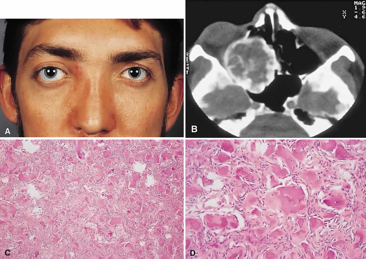 clinicopathologic classification (see Table 1). BENIGN FIBRO-OSSEOUS AND CARTILAGINOUS LESIONS Osteoma A true osteoma is a tumor-like mass of bony tissue that is histologically similar to normal bone. Its pathogenesis remains unclear, although traumatic, infective, or hamartomatous theories have been proposed.4 Others have suggested that osteomas arise exclusively at the junction of bones of cartilaginous and membranous origin.5 None of these theories account for the facts. The most common sites of origin are the paranasal sinuses, skull, and facial bone. The fact that osteomas were found in 0.42% (15 of 3510) of plain sinus radiographs reflects their prevalence.6 In the sinuses, 50% occur in the frontal sinus, with the ethmoid, maxillary, and sphenoid involved in descending order of frequency. Most orbital osteomas are secondary invaders from adjacent sinuses, but on occasion they arise primarily in the orbit. In contrast to the sinus distribution, however, orbital osteomas appear to have a roughly equal origin from the ethmoid, frontoethmoid, or frontal regions.7,8 This may reflect the relatively thin barrier to expansion posed by the medial orbital wall. The age range runs the gamut from 10 to 82 years, with the highest prevalence in the fourth and fifth decades. Males and females are represented equally.7–9 PRESENTATION. Most sinus osteomas are solitary and asymptomatic.6 However, when large enough to encroach on the orbits, a gradual evolution of proptosis or globe displacement over many years can occur (Fig. 1). There may be an associated headache as a result of expansion of the overlying cortex and periosteum, and a bony mass is often palpable in the superior or superomedial orbit. Obstruction of the sinus ostia may lead to chronic sinusitis or mucocele. Less common features include an acquired Brown syndrome,10 gaze-evoked amaurosis or pain,4,11 subluxation of the eye12 and erosion leading to orbital emphysema, or cerebrospinal fluid rhinorrhea.13 The sphenoid sinus, although a rare site, is significant because even a small lesion may lead to an orbital apex syndrome. An uncommon but important systemic association is Gardner's syndrome. This autosomal dominant syndrome of osteomas, soft tissue tumors, and peripheral congenital retinal pigment epithelial hypertrophy also includes the development of colonic polyposis with subsequent malignant transformation.14–16 Multiple osteomas are common; our one patient had only a single tumor, but one was also noted in the skull. Further, because bony lesions may predate the colonic pathology, patients with osteoma warrant a dilated funduscopy and referral to a gastroenterologist.17 IMAGING. The plain radiograph and CT appearances consist of an osteoblastic round or ovoid sharply circumscribed mass, usually arising in the sinus and invading the orbit. Tumors growing in a sinus conform to its internal contour and often have a bosselated surface. Osteomas may be sessile or pedunculated and generally have a diameter of 1 to 5 cm.18 Bone window settings on CT imaging often show a very dense periphery with a more cancellous internal structure. However, the relative proportions of the two densities may vary with the size of the lesion. HISTOPATHOLOGY. It is important to distinguish osteomas from reactive osteomatous responses to infection, trauma, and chronic inflammation. The clinical and radiologic appearances are often invaluable in this regard. Macroscopically, true osteomas have smooth or bosselated contours with a glistening white or pinkish coloration. A covering of mucoperiosteum or periorbita may be seen, depending on the site of origin.18 Osteomas have been classified histologically into three groups depending on the predominant tissue present: compact (cortical, ivory), cancellous (trabecular, spongy), and fibrous. Fu and Perzin19 have postulated that the histologic type is partly dependent on the age of the lesion, with the compact group representing the most mature and the fibrous the least. The fibrous subtype may, in fact, be part of a continuum incorporating ossifying fibroma and fibrous dysplasia. The compact areas resemble normal cortical bone with dense bony areas and haversian systems. However, there are subtle differences in the arrangement of the haversian canals, which is often evident to the experienced bone pathologist. The cancellous areas consist of anastomosing trabeculae with an intervening fibrovascular stroma. Fatty and hematopoietic elements may also be present in the stroma, as well as evidence of osteoblastic activity along the trabeculae. The fibrous region is made up primarily of loose fibrovascular tissue with a few irregular bony trabeculae and osteoid elements. In our series of nine surgically treated cases, we noted that although the three types of tissue were present in varying admixtures, in all cases there was a remarkably consistent pattern of arrangement. The most peripheral zone was made up of compact bone; moving toward the center or base of the lesion, there was an intermediate zone of increased osteoblastic activity, osteoid, and vascularity. The innermost region consisted of a loose fibrous stroma with a greater number of blood vessels, few trabeculae, and many plump osteoblasts. This configuration has been described previously by Albert and associates20 and illustrates the growth of these lesions. The outermost zone presumably represents more mature bone, and the activity seen centrally suggests that this is where growth is initiated. This implies that extirpation of the central region is probably required to prevent recurrence. It may also explain why leaving residual peripheral areas does not usually lead to regrowth. Finally, the histologic subtyping into compact, cancellous, and fibrous lesions probably has little practical significance, because there appears to be no correlation with the clinical course. MANAGEMENT. Generally, asymptomatic osteomas can be treated conservatively. The only p