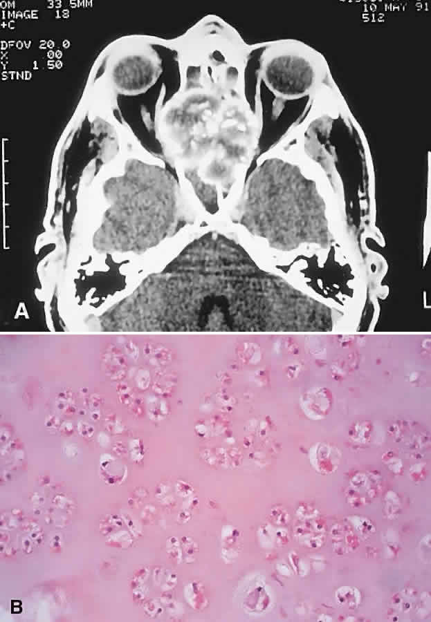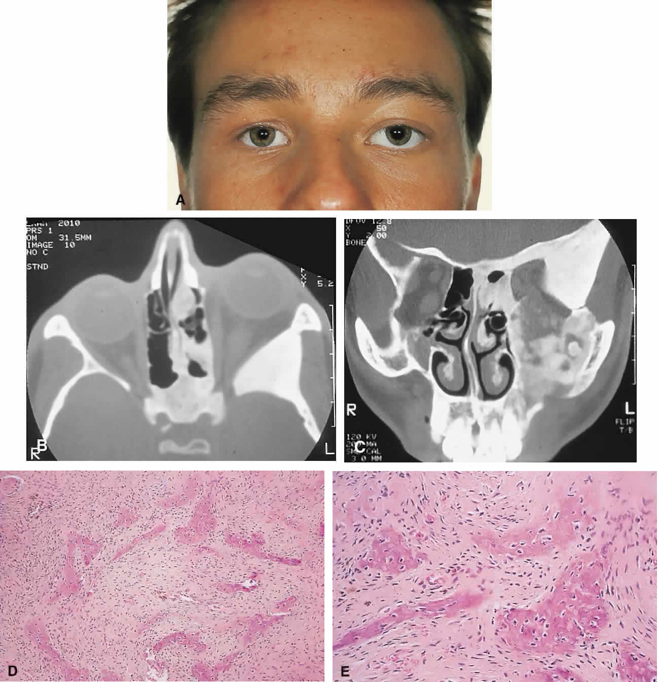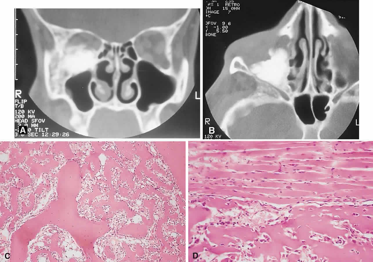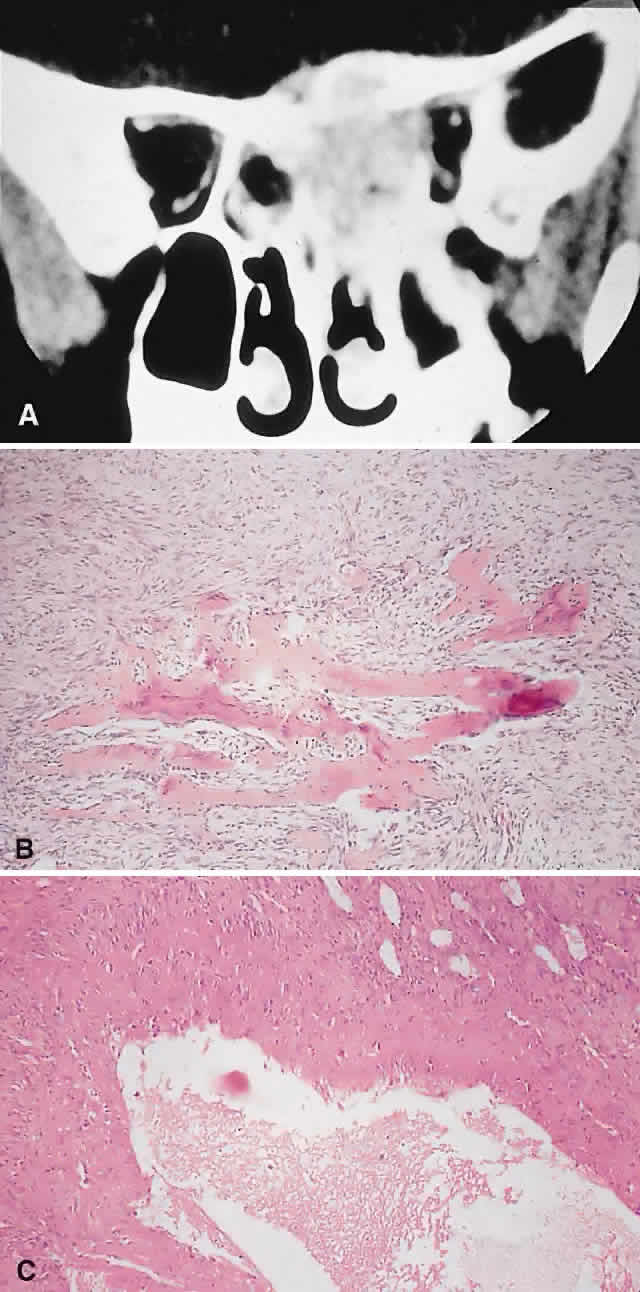 clinicopathologic classification (see Table 1). BENIGN FIBRO-OSSEOUS AND CARTILAGINOUS LESIONS Osteoma A true osteoma is a tumor-like mass of bony tissue that is histologically similar to normal bone. Its pathogenesis remains unclear, although traumatic, infective, or hamartomatous theories have been proposed.4 Others have suggested that osteomas arise exclusively at the junction of bones of cartilaginous and membranous origin.5 None of these theories account for the facts. The most common sites of origin are the paranasal sinuses, skull, and facial bone. The fact that osteomas were found in 0.42% (15 of 3510) of plain sinus radiographs reflects their prevalence.6 In the sinuses, 50% occur in the frontal sinus, with the ethmoid, maxillary, and sphenoid involved in descending order of frequency. Most orbital osteomas are secondary invaders from adjacent sinuses, but on occasion they arise primarily in the orbit. In contrast to the sinus distribution, however, orbital osteomas appear to have a roughly equal origin from the ethmoid, frontoethmoid, or frontal regions.7,8 This may reflect the relatively thin barrier to expansion posed by the medial orbital wall. The age range runs the gamut from 10 to 82 years, with the highest prevalence in the fourth and fifth decades. Males and females are represented equally.7–9 PRESENTATION. Most sinus osteomas are solitary and asymptomatic.6 However, when large enough to encroach on the orbits, a gradual evolution of proptosis or globe displacement over many years can occur (Fig. 1). There may be an associated headache as a result of expansion of the overlying cortex and periosteum, and a bony mass is often palpable in the superior or superomedial orbit. Obstruction of the sinus ostia may lead to chronic sinusitis or mucocele. Less common features include an acquired Brown syndrome,10 gaze-evoked amaurosis or pain,4,11 subluxation of the eye12 and erosion leading to orbital emphysema, or cerebrospinal fluid rhinorrhea.13 The sphenoid sinus, although a rare site, is significant because even a small lesion may lead to an orbital apex syndrome. An uncommon but important systemic association is Gardner's syndrome. This autosomal dominant syndrome of osteomas, soft tissue tumors, and peripheral congenital retinal pigment epithelial hypertrophy also includes the development of colonic polyposis with subsequent malignant transformation.14–16 Multiple osteomas are common; our one patient had only a single tumor, but one was also noted in the skull. Further, because bony lesions may predate the colonic pathology, patients with osteoma warrant a dilated funduscopy and referral to a gastroenterologist.17 IMAGING. The plain radiograph and CT appearances consist of an osteoblastic round or ovoid sharply circumscribed mass, usually arising in the sinus and invading the orbit. Tumors growing in a sinus conform to its internal contour and often have a bosselated surface. Osteomas may be sessile or pedunculated and generally have a diameter of 1 to 5 cm.18 Bone window settings on CT imaging often show a very dense periphery with a more cancellous internal structure. However, the relative proportions of the two densities may vary with the size of the lesion. HISTOPATHOLOGY. It is important to distinguish osteomas from reactive osteomatous responses to infection, trauma, and chronic inflammation. The clinical and radiologic appearances are often invaluable in this regard. Macroscopically, true osteomas have smooth or bosselated contours with a glistening white or pinkish coloration. A covering of mucoperiosteum or periorbita may be seen, depending on the site of origin.18 Osteomas have been classified histologically into three groups depending on the predominant tissue present: compact (cortical, ivory), cancellous (trabecular, spongy), and fibrous. Fu and Perzin19 have postulated that the histologic type is partly dependent on the age of the lesion, with the compact group representing the most mature and the fibrous the least. The fibrous subtype may, in fact, be part of a continuum incorporating ossifying fibroma and fibrous dysplasia. The compact areas resemble normal cortical bone with dense bony areas and haversian systems. However, there are subtle differences in the arrangement of the haversian canals, which is often evident to the experienced bone pathologist. The cancellous areas consist of anastomosing trabeculae with an intervening fibrovascular stroma. Fatty and hematopoietic elements may also be present in the stroma, as well as evidence of osteoblastic activity along the trabeculae. The fibrous region is made up primarily of loose fibrovascular tissue with a few irregular bony trabeculae and osteoid elements. In our series of nine surgically treated cases, we noted that although the three types of tissue were present in varying admixtures, in all cases there was a remarkably consistent pattern of arrangement. The most peripheral zone was made up of compact bone; moving toward the center or base of the lesion, there was an intermediate zone of increased osteoblastic activity, osteoid, and vascularity. The innermost region consisted of a loose fibrous stroma with a greater number of blood vessels, few trabeculae, and many plump osteoblasts. This configuration has been described previously by Albert and associates20 and illustrates the growth of these lesions. The outermost zone presumably represents more mature bone, and the activity seen centrally suggests that this is where growth is initiated. This implies that extirpation of the central region is probably required to prevent recurrence. It may also explain why leaving residual peripheral areas does not usually lead to regrowth. Finally, the histologic subtyping into compact, cancellous, and fibrous lesions probably has little practical significance, because there appears to be no correlation with the clinical course. MANAGEMENT. Generally, asymptomatic osteomas can be treated conservatively. The only p