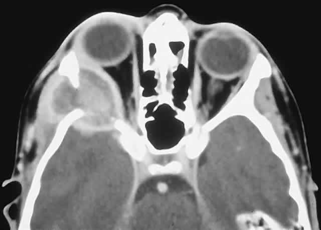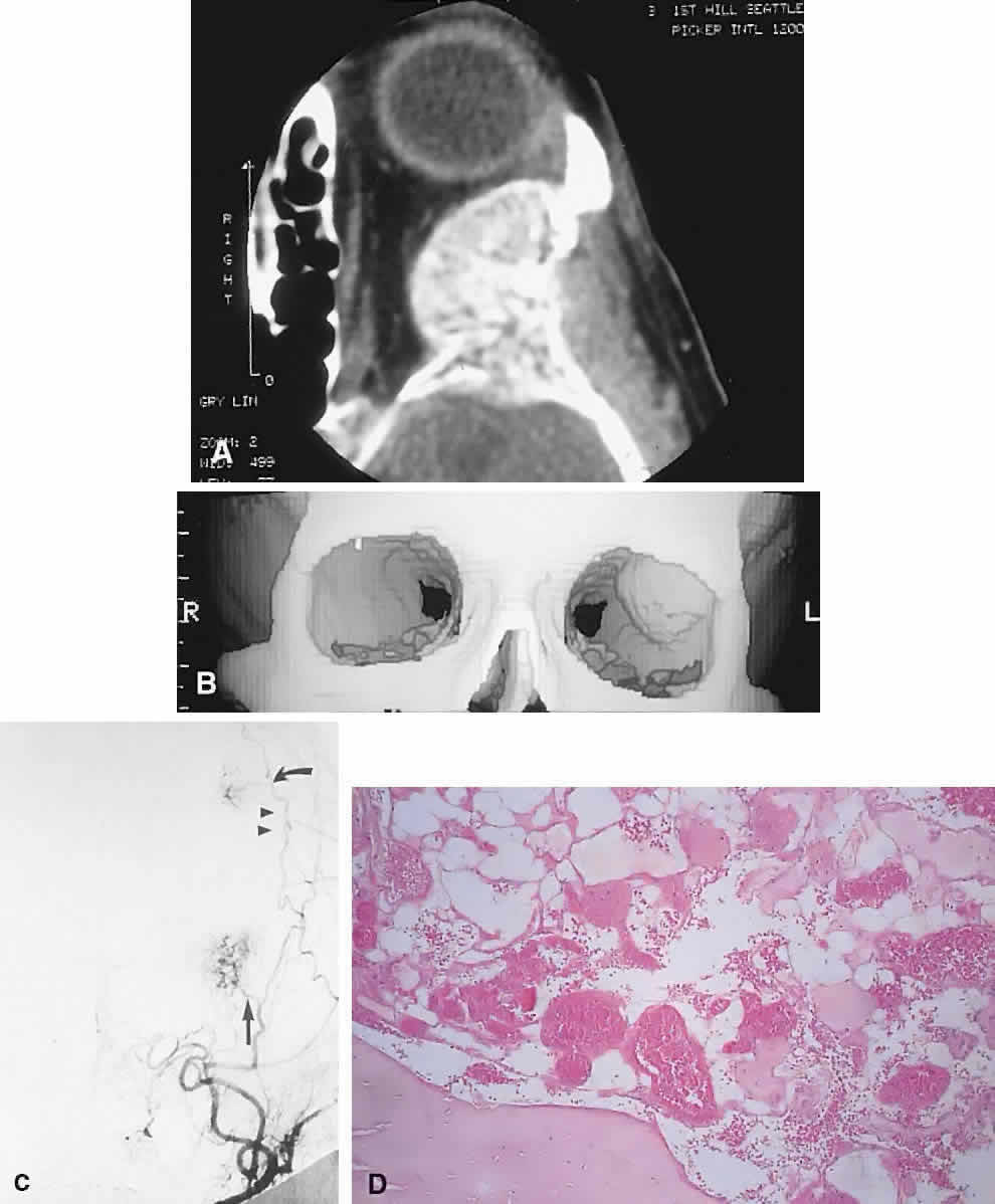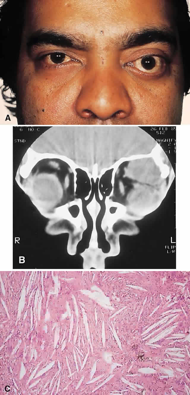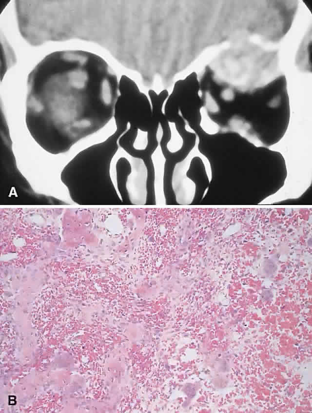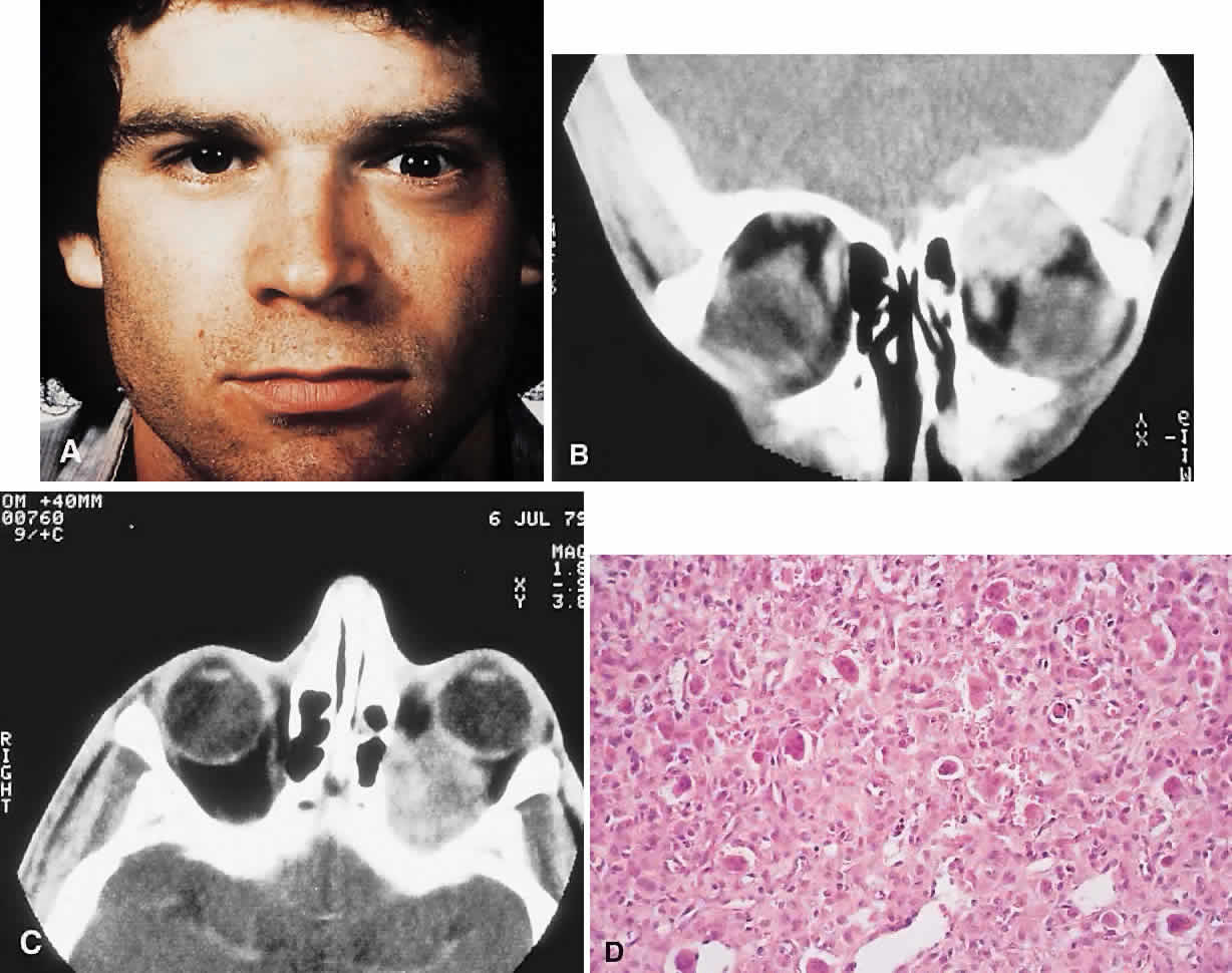 Most primary orbital bone tumors belong to one of three categories. SLOW, PROGRESSIVE, NONINFILTRATIVE MASS EFFECT The prototypical presentation in this group is that of a benign fibro-osseous lesion such as an osteoma. Proptosis, globe displacement, and deformity are the most common manifestations; the temporal course is measured in years. Any functional deficits, such as decreased vision or diplopia, are due purely to mechanical or compressive effects. SUBACUTE MASS EFFECT WITH OR WITHOUT SUDDEN SOFT TISSUE DISPLACEMENT The reactive lesions of bone such as aneurysmal bone cyst, giant cell granuloma, and cholesterol granuloma often fall in this category. The evolution of the mass effect in these cases usually varies from weeks to months but can extend to years. In addition, they may be subject to intralesional hemorrhage, leading to sudden proptosis or displacement. RELENTLESS PROGRESSION OF MASS EFFECT WITH OR WITHOUT INFILTRATIVE FEATURES Neoplasia, in the form of osteosarcoma, Ewing's sarcoma, myeloma, and chondrosarcoma, frequently presents in this manner. The acuity of onset, with the exception of chondrosarcoma, is quicker than in the first category, and signs of infiltration, such as significant pain, decreased vision, or restriction of ocular movement, may be present. |