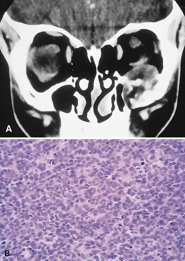 Structural lesions such as dermoid or epidermoid cysts may give rise to confusion with cystic bone tumors. MRI can be helpful in excluding the nonlipid-containing lesions but may not be able to differentiate cholesterol granulomas. Orbital bone may also be secondarily invaded by chordoma, a rare slow-growing intraosseous tumor arising from notochordal remnants.164 When located in the dorsum sella or clivus, it may grow anteriorly to involve the orbital apex. Radiologically, it appears as a heterogeneous destructive lesion with an extraorbital focus. Histologically, it is characterized by large vacuolated (physaliphorous) cells. Primary intraosseous lymphomas have not been reported as orbital lesions, but our experience includes two cases of paraorbital involvement. Both patients had disseminated recurrent lymphoma and developed an intraosseous tumor in the region of the sphenoid sinus, with subsequent orbital invasion. |