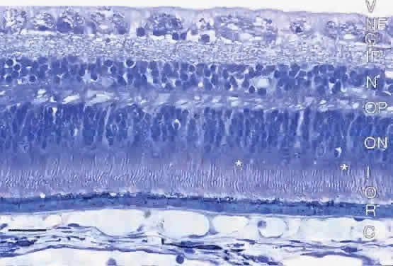The outer nuclear layer contains the cell bodies and nuclei of the rods and cones (see Fig. 2). In the parafovea, the outer nuclear layer contains 8 to 10 rows of nuclei that belong mainly to cones. In the remainder of the retina, the outer nuclear layer contains five rows of nuclei, with a single, outermost row of cone nuclei and four rows of rod nuclei internal to them.11 The rod nuclei are smaller and contain denser chromatin than those of the cones. |