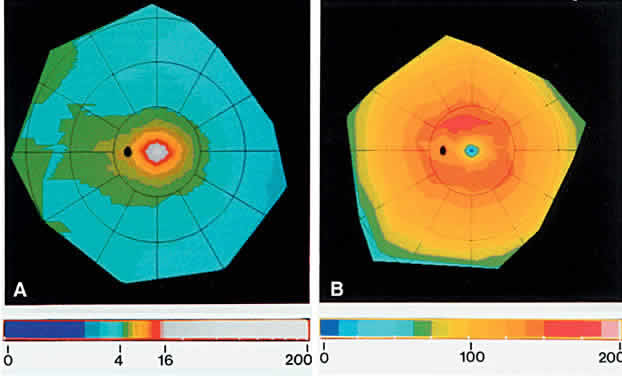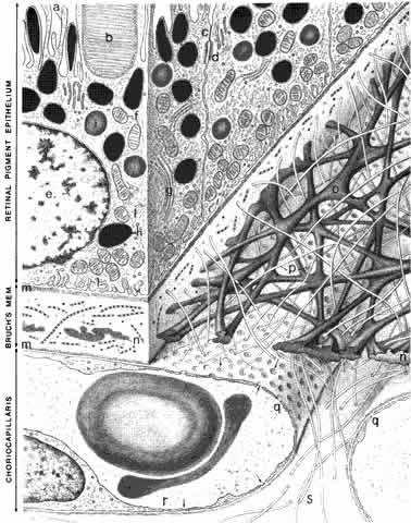 space. The RPE cells are essential for photoreceptor health and have several other functions, including vitamin A metabolism and regeneration in the visual cycle,4 phagocytosis and degradation of shed outer segment tips, light absorption by melaningranules, heat exchange, secretion of the matrix surrounding the photoreceptor inner and outer segments, and active transport of materials between the choriocapillaris and the subretinal space. The RPE cells are smaller (approximately 10 to 14 μm diameter) and contain more melanin in the macula, and are flatter and wider (up to 60 μmdiameter) with less pigment in the periphery. Photoreceptor density also varies across the retina, but a relatively constant ratio of 45 photoreceptors per RPE cell is found in all retinal regions.5 Each RPE cell is polarized with an apical part adjacent to the subretinal space and a basal portion facing Bruch's membrane. The apical surface has numerous long microvilli that envelop the photoreceptor outer segments and are involved in phagocytosis of shed outer segment tips. The apical portion also contains numerous cytoplasmic filaments, microtubules, and football-shaped melanin granules (see Fig. 3). The melanin is thought to absorb stray light, decreasing light scatter within the eye. The midportion of the RPE cell contains the nucleus, cytoplasmic organelles for protein synthesis (ribosomes, rough endoplasmic reticulum, and Golgi apparatus), smooth endoplasmic reticulum, phagosomes containing outer segment tips undergoing digestion by lysosomal enzymes, and lipofuscin granules. The lipofuscin granules, which increase in number with normal aging, represent residual outer segment lipids incompletely digested by lysosomal activity. The lipofuscin granules are autofluorescent (Fig. 4A) and are relatively sparse in the RPE of children. RPE cells in older eyes are engorged with lipofuscin granules, which also contain incompletely digested melanin granules. The highest density of RPE lipofuscin is found in the macula; this high concentration of lipofuscin granules may compromise RPE functions and has been suggested to cause macular degeneration.6 The lateral and basal surfaces of the RPE cells are highly specialized, containing a variety of different receptors and ion channels. The RPE basal surfaces are infolded, increasing the area of the RPE surface membrane. The basal RPE surface rests on a basal lamina that forms the innermost layer of Bruch's membrane. The other layers of Bruch's membrane are the inner collagenous, elastin, outer collagenous, and the basal lamina of the choriocapillaris (see Fig. 3). The RPE cells have electrogenic sodium-potassium pumps in the apical membrane and chloride-bicarbonate exchange transporters in the basal membrane. The net effect of the pumps, transport systems, and passive ion channels is movement of water across the RPE in a retina-to-choroid direction, promoting adhesion of the neurosensory retina to the RPE.5 |