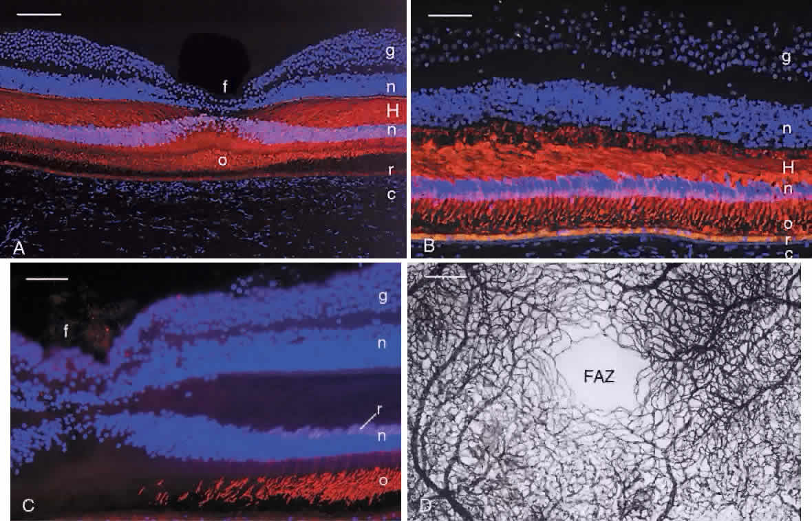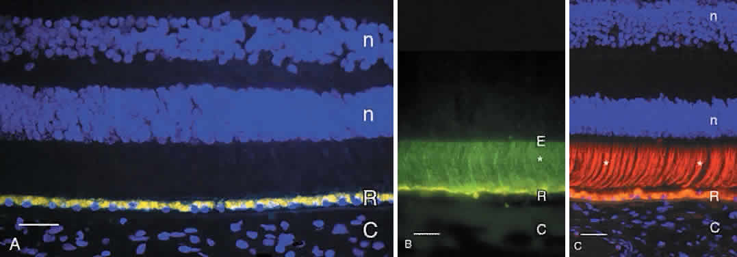 The RPE secretes some of the molecules that fill the subretinal (interphotoreceptor) space. This space, the remnant of the ventricular lumen present during fetal development, is delineated by the apical surfaces of the photoreceptor, Müller, and RPE cells. The outer margin of the space is established by the zonulae occludentes (tight junctions) between the RPE cells, and the inner margin is defined by the external limiting membrane, formed by intermediate junctions (zonulae adherentes) between photoreceptor inner segments and Müller cell apical processes.7 This space is filled with the interphotoreceptor matrix, a heterogeneous collection of proteins/glycoproteins, enzymes, and glycosaminoglycans/proteoglycans that surround the rod and cone inner and outer segments. Notable components of the interphotoreceptor matrix are interphotoreceptorretinoid binding protein (see Fig. 4B), though to function in transport of vitamin A between photoreceptors and the RPE,4 and the matrix sheaths that surround individual rod and cone outer segments. The matrix sheaths of rods and cones differ in composition: those of the rods are stained by certain plant lectins, notably wheat germ agglutinin, while the cone sheaths are positive with other lectins, including peanut agglutinin (see Fig. 4C). The sheaths of the specialized foveal cones are labeled with wheat germ agglutinin and elderberry bark lectins. These matrix sheaths are thought to isolate individual photoreceptor outer segments, maintain outer segment orientation, and contribute to attachment of the photoreceptors to the apical surfaces of the RPE cells.8 |