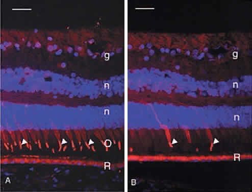 layer of photoreceptor axons and synapses (see Fig. 5B). Humans have a single type of rod with a long, thin outer segment containing the visual pigment, rhodopsin, which absorbs maximally at 500 nm. The cone outer segments are shorter and wider and somewhat conical. Each of the three cone types contains a different cone opsin that absorbs maximally in the red (564 nm; L cones), green (533 nm; M cones), or blue (437 nm; S cones) region of the spectrum. The visual pigments can be demonstrated by immunocytochemistry using antibodies specific for the different proteins. Rod outer segments are strongly labeled with anti-rhodopsin (Fig. 6). The composition of the red cone pigment is so similar to that of the green cone pigment that they cannot be differentiated by immunocytochemistry, but the majority of cone outer segments are labeled with an antibody that recognizes both red- and green-sensitive cones (Fig. 7A). A minority of the cones are blue-sensitive (see Fig. 7B).