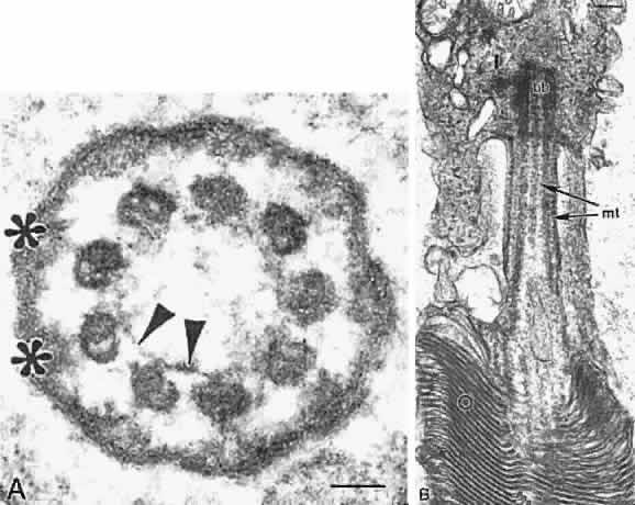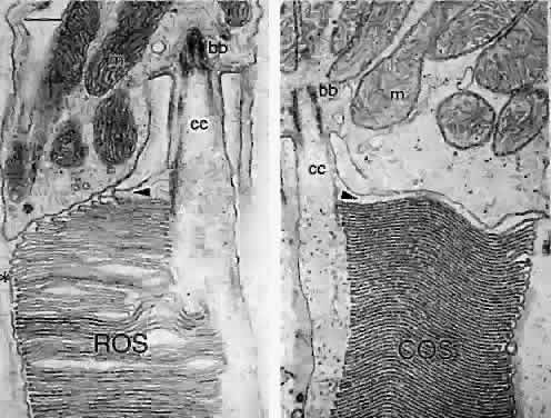 The normal human retina contains approximately 4.6 million cones, with a peak foveal cone density of approximately 199,000 cones/mm2 (Fig. 8). There are approximately 92 million rods, with highest rod density (more than 150,000 rods/mm2) in a ring at the eccentricity of the optic disc.9 Blue-sensitive cones are absent in the foveal center, most numerous (over 2000 cells/mm2) in a ring at 0.1 to 0.3 mm from the foveal center, and constitute approximately 7% of the cones in the periphery.10 The photoreceptor inner segments contain a cluster of mitochondria forming the ellipsoid, and organelles for protein synthesis (ribosomes, rough endoplasmic reticulum, and Golgi apparatus) in the myoid between the ellipsoid and cell nucleus. The rod and cone outer segments are formed by stacks of membranes containing the visual pigments, rhodopsin and the cone opsins, respectively. In rods, the membranes pinch off at the base of the outer segment to form multiple discs resembling a stack of coins, surrounded by the plasma membrane (Fig. 9). There is ongoing addition of newly synthesized rhodopsin into these membrane discs as they form at the base of the rod outer segment. The newly synthesized protein can be traced by light microscopic radioautography after pulse labeling an animal with radioactive amino acids that are incorporated into rhodopsin being synthesized in the inner segment. The radioactive rhodopsin is then inserted into newly forming basal discs and appears as a dark band across the outer segment in radioautographs. These labeled discs are displaced outward by continuous addition of new, unlabeled discs at the outer segment base (Fig. 10). The process of disc addition is balanced by periodic shedding of the outer segment tip, which is phagocytosed and degraded by RPE lysosomal activity. In primates, complete renewal of a rod outer segment occurs in a about 2 weeks. In cones, the outer segment membranes remain continuous with the surface membrane (see Fig. 9), such that newly synthesized photopigment is inserted diffusely into the outer segment, rather than as a band as found in rods. The time course of cone outer segment renewal is not known. The photoreceptor outer and inner segmentsare joined by a thin stalk, the connecting cilium(Fig. 11). This cilium originates in a basal body (centriole) in the inner segment and as viewed in cross section by electron microscopy contains a ring of nine microtubule doublets typical of a sensory cilium. A central pair of microtubules, characteristic of motile cilia, is absent in the photoreceptor connecting cilium. The cilium is the only connection between the outer and inner segments and is thought to function as a conduit for transport of newly synthesized proteins such as visual pigments from the inner to the outer segment. |
