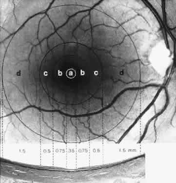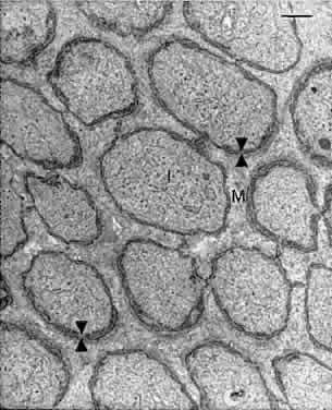 macula course directly to the disc as the papillomacular bundle. Axons of the nerve fiber layer are unmyelinated and are 0.6 to 2.0 μm in diameter. The cytoplasm of the axons contains microtubules, microfilaments, mitochondria, and vesicles undergoing axonal transport to and from the cell body and central synapses. After passing through the lamina cribrosa of the optic disc, the individual ganglion cell axons become myelinated and the diameter of the optic nerve expands at this point. |