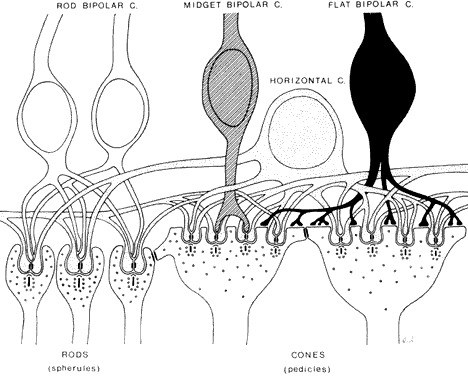 is a complex topic under active investigation. The circuitry for cone signals differs from that for rods in several ways. In the outer plexiform layer, cones synapse onto various cone bipolar cell types rather than onto a single type, as in the rod system. Some cone bipolars synapse in sublamina a of the inner plexiform layer onto “off” ganglion cells, and others synapse in sublamina b onto “on” ganglion cells. Fewer cones converge onto a cone bipolar cell than the numerous rods that input on to a rod bipolar; additionally, relatively few cone bipolar cells converge onto a given ganglion cell. The lowest convergence ratio is found in the midget system in the fovea, where a single L or M cone synapses onto two midget bipolar cells (one “on” and one “off”), which in turn synapse onto two midget ganglion cells (one “on” and one “off”), respectively. This two-to-one relationship between a foveal cone and midget bipolars, with a one-to-one relationship between each midget bipolar and midget ganglion cell, provides the highest level of resolution in the visual pathway. Amacrine cells are also involved in the cone system, modifying the ganglion cell receptive fields and center response. These interactions are complex and not well understood. |