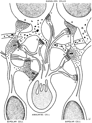 The inner plexiform layer contains distinct strata of synapses from cells in the inner nuclear layer (Fig. 15). These strata comprise precisely ordered processes and synapses of the different neuron types. The outer part (sublamina a) contains strata S1 and S2; the inner part (sublamina b) contains strata S3, S4, and S5. Ganglion cells that respond to a spot of light when it is turned on ( “on” center cells) have their dendrites in the inner strata, S3, S4, and S5; ganglion cells that respond to a spot of light when it is turned off ( “off” center cells) have their processes in the outer strata, S1 and S2.21 By virtue of the level of their axon terminals in the inner plexiform layer, specific bipolar cell types synapse with ganglion cells and amacrine cells whose dendrites ramify in the same stratum or sublamina. Occasional cell bodies in the inner plexiform layer are displaced amacrine or ganglion cells. |