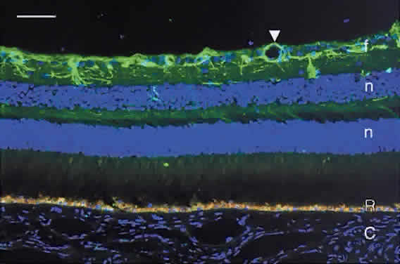 of the retina to the subretinal space(Fig. 16). The Müller cell body and nucleus are located midway in the inner