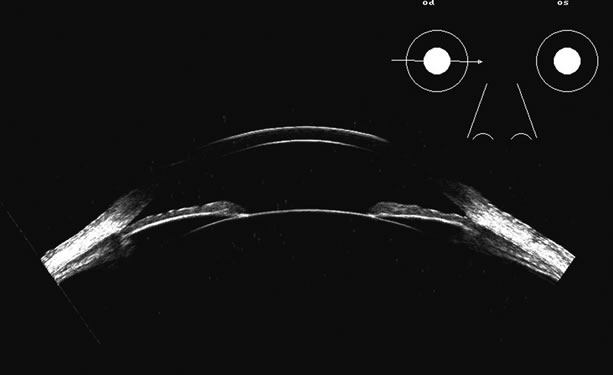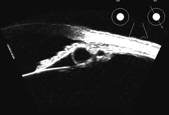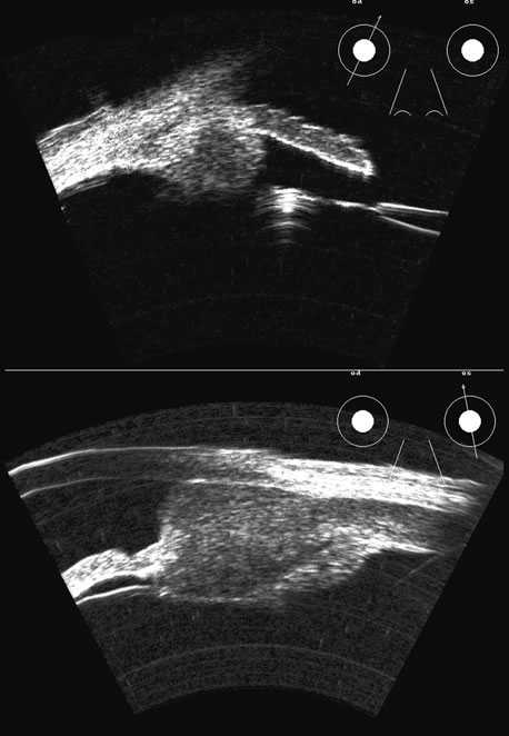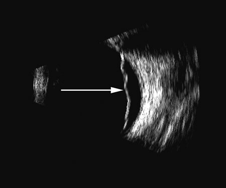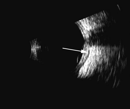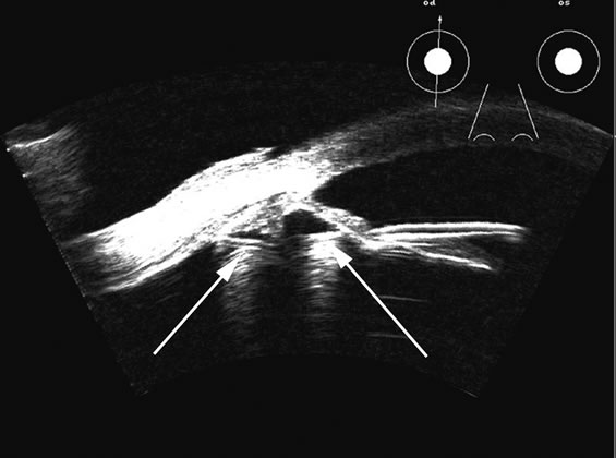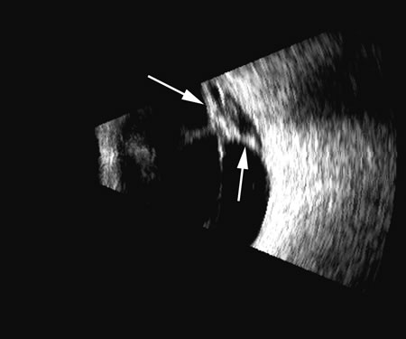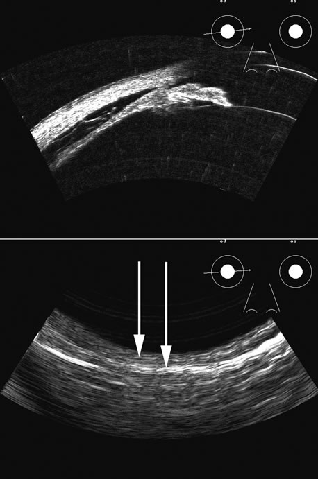 Hypotony is easily diagnosed by direct measurement of intraocular pressure, but the underlying cause is difficult to evaluate.11 High-frequency ultrasound scans can easily reveal separation of the ciliary body and the sclera. This allows different forms of hypotony to be determined—for example: tractional with membrane attached; primary as idiopathic, often inflammatory or hemorrhagic; and dehiscence secondary to iridodialysis or scleral perforation (Fig. 6). |