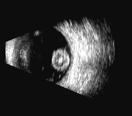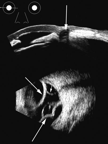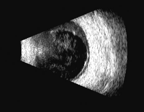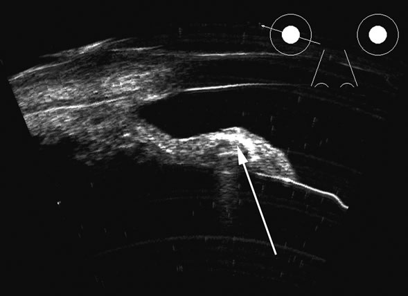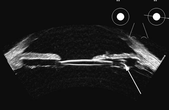 in the 50 MHz range for examining this region.5–7 Lens position, presence, and integrity can be shown most easily with immersion ultrasound, since the proximity of these structures to the transducer in contact techniques makes them difficult to display. Immersion or a water standoff makes it possible to visualize the anterior segment by moving the “noise” of the main bang of the transducer forward, away from the structures of interest and the focal zone onto this area.8 The lens is a “specular” reflector which, like the cornea, is a smooth, highly reflective surface. Whereas specular reflectors, such as the lens, may deflect most acoustic energy away from the transducer when insonified at an oblique angle, “diffuse” reflectors, such as blood-covered membranes, are more easily discerned on B-scan. Blood enhances lens boundaries; that is, it converts the specular reflective surface to a diffuse reflective surface, making the entire outline of the surface more easily seen, even at regions angled so they would otherwise deflect the returning echoes away from the transducer and not be identifiable. The posterior capsule is concave and thus perpendicular to the beam over much of the arc of sector B-scanning, thus making it always easy to identify. The lens outline should be smooth and unbroken (Fig. 1); a damaged lens often is cataractous and has internal echoes as well as interrupted surface echoes.9 Kinetic scanning, that is, real-time scanning while the patient moves his or her eye, can be used to check for mobility of the lens in dislocated or partially dislocated lenses. The four main areas of interest in the posterior chamber to the ocular surgeon are (1) iris and ciliary body tumors, (2) intraocular foreign bodies and trauma that may involve the lens, (3) intraocular lens placement and position that may cause irritation or decreased vision, and (4) hypotony with separation of the ciliary body from the sclera.10 Examples of a retroiridal cyst and a tumor are shown in Figures 2 and 3. Intraocular lens displacement, particularly erosion of haptics that may produce bleeding, is a commonly seen problem. An intraocular lens with a folded haptic is seen in Figure 4 and a retro displaced haptic is shown in Figure 5.